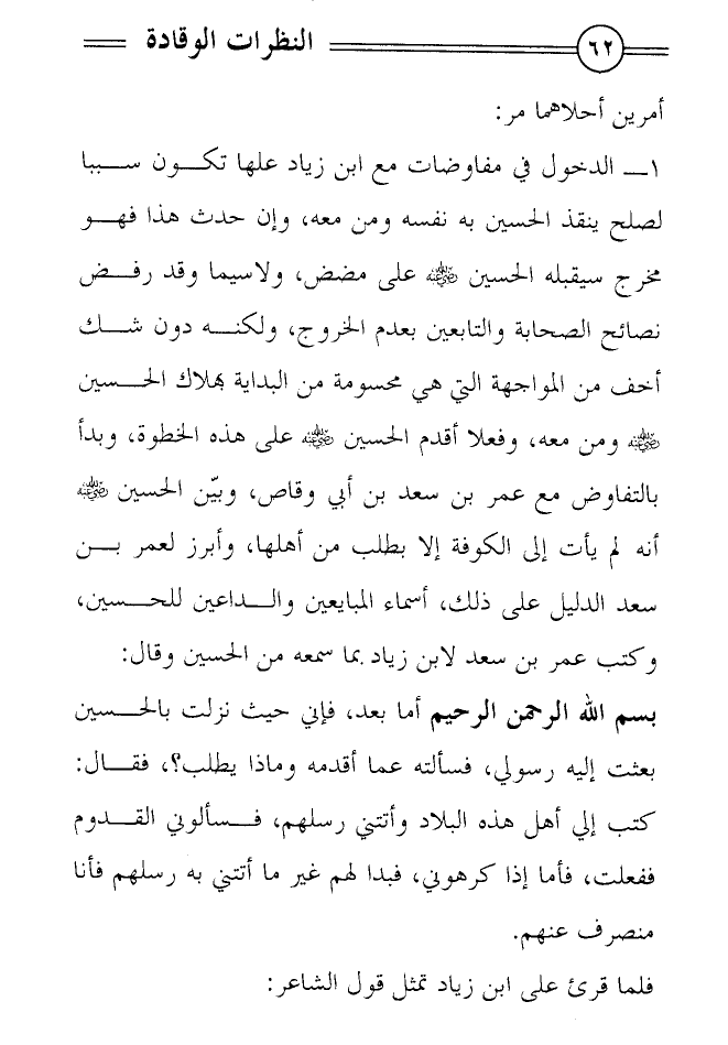 كتاب النظرات الوقادة في خروج الحسين بن علي رضي الله عنه واستشهاده