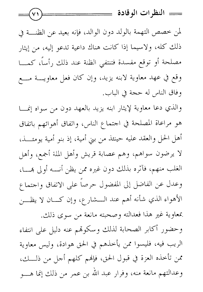 والذي دعا معاوية لإيثار ابنه يزيد بالعهد دون من سواه إنما هو مراعاة المصلحة في اجتماع الناس، واتفاق أهوائهم باتفاق أهل الحل والعقد عليه حينئذ من بني أمية، إذ بنو أمية يومئذ، لا يرضون سواهم، وهم عصابة قريش وأهل الملة أجمع، وأهل الغلب منهم، فآثره بذلك دون غيره ممن يظن أنه أولى بها، وعدل عن الفاضل إلى المفضول حرصاً على الاتفاق واجتماع الأهواء الذي شأنه أهم عند الشارع، وإن كان لا يظن بمعاوية غير هذا فعدالته وصحبته مانعة من سوى ذلك.