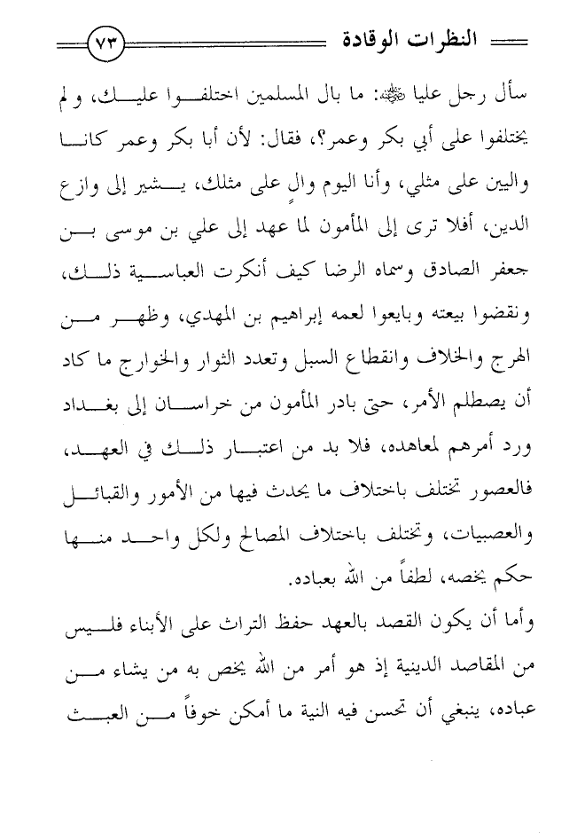 سأل رجل عليا - رضي الله عنه -: ما بال المسلمين اختلفوا عليك، ولم يختلفوا على أبي بكر وعمر؟ ، فقال: لأن أبا بكر وعمر كانا واليين على مثلي، وأنا اليوم والٍ على مثلك، يشير إلى وازع الدين، أفلا ترى إلى المأمون لما عهد إلى علي بن موسى بن جعفر الصادق وسماه الرضا كيف أنكرت العباسية ذلك، ونقضوا بيعته وبايعوا لعمه إبراهيم بن المهدي، وظهر من الهرج والخلاف وانقطاع السبل وتعدد الثوار والخوارج ما كاد أن يصطلم الأمر، حتى بادر المأمون من خراسان إلى بغداد ورد أمرهم لمعاهده، فلا بد من اعتبار ذلك في العهد، فالعصور تختلف باختلاف ما يحدث فيها من الأمور والقبائل والعصبيات، وتختلف باختلاف المصالح ولكل واحد منها حكم يخصه، لطفاً من الله بعباده.