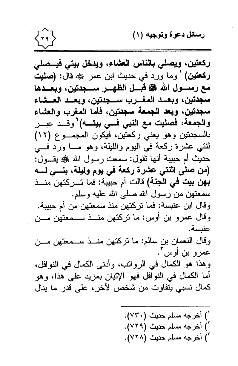 ركعتين، ويصلي بالناس العشاء، ويدخل بيتي فيصلي ركعتين" (¬1) وما ورد في حديث ابن عمر - رضي الله عنه - قال: "صليت مع رسول الله - صلى الله عليه وسلم - قبل الظهر سجدتين، وبعدها سجدتين، وبعد المغرب سجدتين، وبعد العشاء سجدتين، وبعد الجمعة سجدتين، فأما المغرب والعشاء والجمعة، فصليت مع النبي في بيته" (¬2) وقد عبر بالسجدتين وهو يعني ركعتين، فيكون المجموع (12) ثنتي عشرة ركعة في اليوم والليلة، وهو ما ورد في حديث أم حبيبة أنها تقول: سمعت رسول الله - صلى الله عليه وسلم - يقول: (من صلى اثنتي عشرة ركعة في يوم وليلة، بني له بهن بيت في الجنة) قالت أم حبيبة: فما تركتهن منذ سمعتهن من رسول الله صلى الله عليه وسلم.