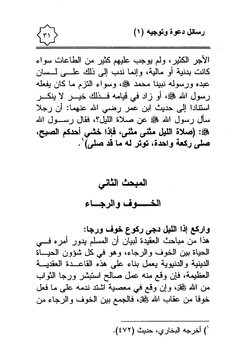 الأجر الكثير، ولم يوجب عليهم كثير من الطاعات سواء كانت بدنية أو مالية، وإنما ندب إلى ذلك على لسان عبده ورسوله نبينا محمد - صلى الله عليه وسلم -، وسواء التزم ما كان يفعله رسول الله - صلى الله عليه وسلم -، أو زاد في قيامه فذلك خير لا ينكر استنادا إلى حديث ابن عمر رضي الله عنهما: أن رجلا سأل رسول الله - صلى الله عليه وسلم - عن صلاة الليل؟ ، فقال رسول الله - صلى الله عليه وسلم -: (صلاة الليل مثنى مثنى، فإذا خشي أحدكم الصبح، صلى ركعة واحدة، توتر له ما قد صلى) (¬1).