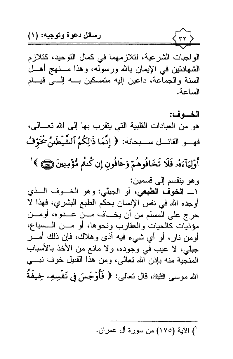 هو من العبادات القلبية التي يتقرب بها إلى الله تعالى، فهو القائل سبحانه: {إِنَّمَا ذَلِكُمُ الشَّيْطَانُ يُخَوِّفُ أَوْلِيَاءَهُ فَلَا تَخَافُوهُمْ وَخَافُونِ إِنْ كُنْتُمْ مُؤْمِنِينَ} (¬1) وهو ينقسم إلى قسمين: