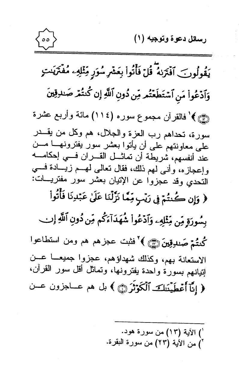 يَقُولُونَ افْتَرَاهُ قُلْ فَأْتُوا بِعَشْرِ سُوَرٍ مِثْلِهِ مُفْتَرَيَاتٍ وَادْعُوا مَنِ اسْتَطَعْتُمْ مِنْ دُونِ اللَّهِ إِنْ كُنْتُمْ صَادِقِينَ} (¬1) فالقرآن مجموع سوره (114) مائة وأربع عشرة سورة، تحداهم رب العزة والجلال، هم وكل من يقدر على معاونتهم على أن يأتوا بعشر سور يفترونها من عند أنفسهم، شريطة أن تماثل القران في إحكامه وإعجازه، وأنى لهم ذلك، فقال تعالى لهم زيادة في التحدي وقد عجزوا عن الإتيان بعشر سور مفتريات: {وَإِنْ كُنْتُمْ فِي رَيْبٍ مِمَّا نَزَّلْنَا عَلَى عَبْدِنَا فَأْتُوا بِسُورَةٍ مِنْ مِثْلِهِ وَادْعُوا شُهَدَاءَكُمْ مِنْ دُونِ اللَّهِ إِنْ كُنْتُمْ صَادِقِينَ} (¬2) فثبت عجزهم هم ومن استطاعوا الاستعانة بهم، وكذلك شهداؤهم، عجزوا جميعا عن إتيانهم بسورة واحدة يفترونها، وتماثل أقل سور القرآن، {إِنَّا أَعْطَيْنَاكَ الْكَوْثَرَ} بل هم عاجزون عن