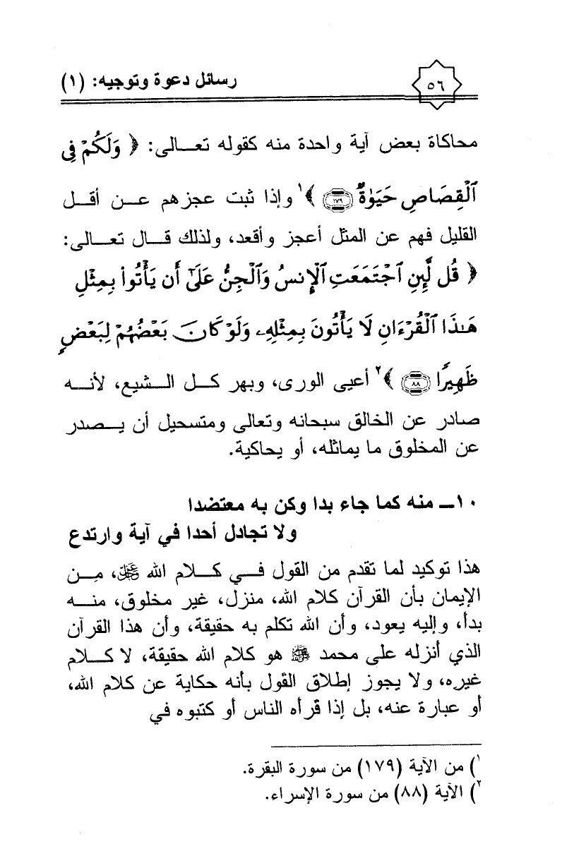 محاكاة بعض آية واحدة منه كقوله تعالى: {وَلَكُمْ فِي الْقِصَاصِ حَيَاةٌ} (¬1) وإذا ثبت عجزهم عن أقل القليل فهم عن المثل أعجز وأقعد، ولذلك قال تعالى: {قُلْ لَئِنِ اجْتَمَعَتِ الْإِنْسُ وَالْجِنُّ عَلَى أَنْ يَأْتُوا بِمِثْلِ هَذَا الْقُرْآنِ لَا يَأْتُونَ بِمِثْلِهِ وَلَوْ كَانَ بَعْضُهُمْ لِبَعْضٍ ظَهِيرًا} (¬2) أعيى الورى، وبهر كل الشيع، لأنه صادر عن الخالق سبحانه وتعالى ومتسحيل أن يصدر عن المخلوق ما يماثله، أو يحاكيه.