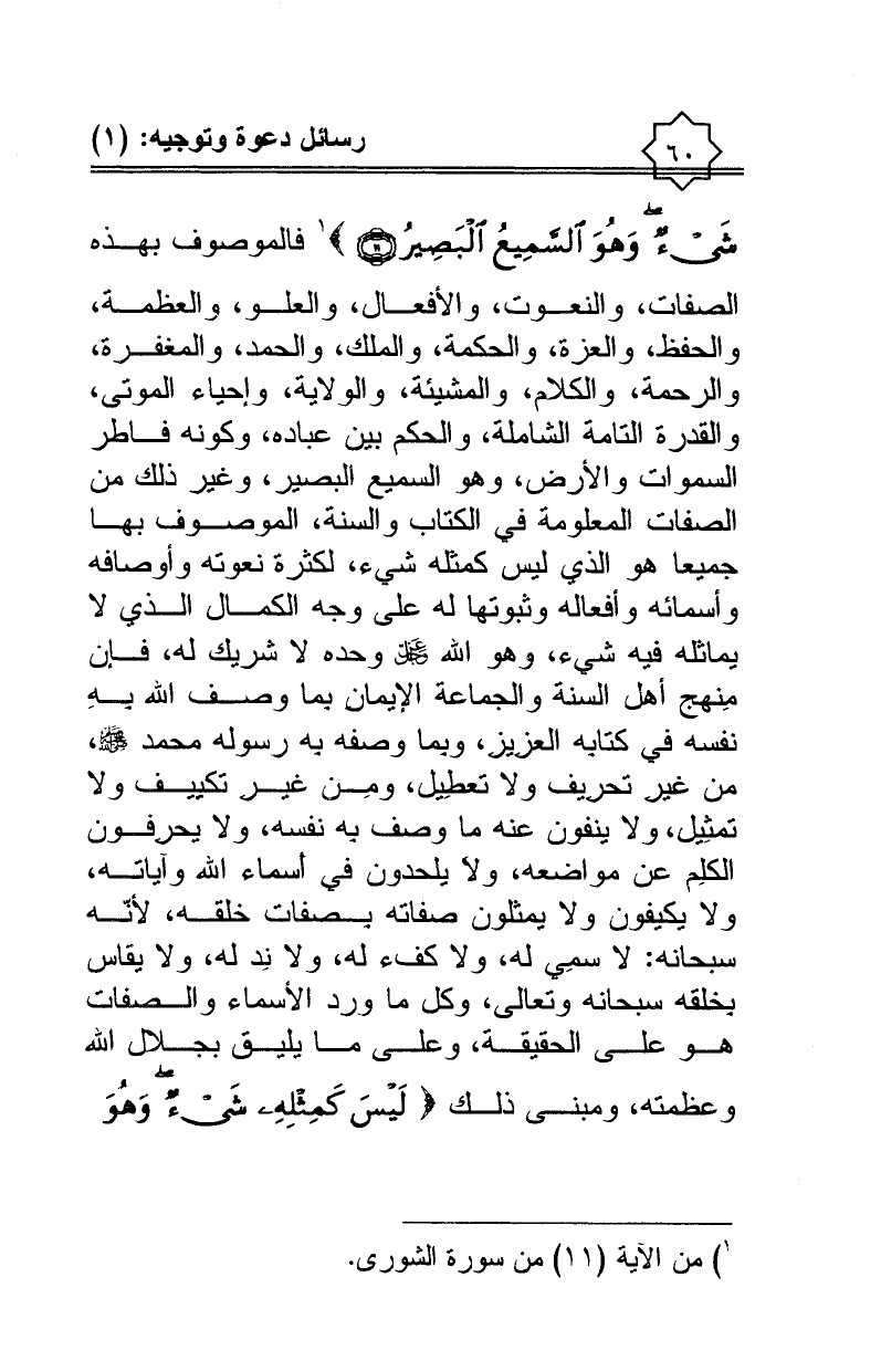 شَيْءٌ وَهُوَ السَّمِيعُ الْبَصِيرُ} (¬1) فالموصوف بهذه الصفات، والنعوت، والأفعال، والعلو، والعظمة، والحفظ، والعزة، والحكمة، والملك، والحمد، والمغفرة، والرحمة، والكلام، والمشيئة، والولاية، وإحياء الموتى، والقدرة التامة الشاملة، والحكم بين عباده، وكونه فاطر السموات والأرض، وهو السميع البصير، وغير ذلك من الصفات المعلومة في الكتاب والسنة، الموصوف بها جميعا هو الذي ليس كمثله شيء، لكثرة نعوته وأوصافه وأسمائه وأفعاله وثبوتها له على وجه الكمال الذي لا يماثله فيه شيء، وهو الله - عز وجل - وحده لا شريك له، فإن مِنهج أهل السنة والجماعة الإيمانِ بِما وصف الله بِهِ نفسه في كتابِه العزِيزِ، وبِما وصفه بِه رسوله محمد - صلى الله عليه وسلم -، من غيرِ تحرِيف ولا تعطِيل، ومِن غيرِ تكيِيف ولا تمثِيل، ولا ينفون عنه ما وصف بِه نفسه، ولا يحرِفون الكلِم عن مواضعه، ولاَ يلحدون في أَسماء الله وآياته، ولا يكيفون ولا يمثلون صفاته بِصفات خلقه، لأنّه سبحانه: لا سمِي له، ولا كفء له، ولا نِد له، ولا يقاس بِخلقه سبحانه وتعالى، وكل ما ورد الأسماء والصفات هو على الحقيقة، وعلى ما يليق بجلال الله وعظمته، ومبنى ذلك {لَيْسَ كَمِثْلِهِ شَيْءٌ وَهُوَ
