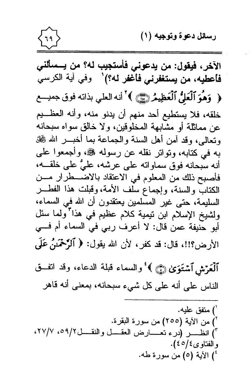 الآخرِ، فيقول: من يدعوني فأستجيب له؟ من يسأَلني فأُعطيه، من يستغفرني فأَغفر له؟ ) (¬1) وفي آية الكرسي {وَهُوَ الْعَلِيُّ الْعَظِيمُ} (¬2) أنه العلي بذاته فوق جميع خلقه، فلا يستطيع أحد منهم أن يدنو منه، وأنه العظيم عن مماثلة أو مشابهة المخلوقين، ولا خالق سواه سبحانه وتعالى، وقد آمن أهل السنة والجماعة بما أخبر الله - عز وجل - به في كتابه، وتواتر نقله عن رسوله - صلى الله عليه وسلم -، وأجمعوا على أنه سبحانه فوق السماوات على عرشه، عليُّ على خلقه، فأصبح ذلك من المعلوم في الاعتقاد بالاضطرار من الكتاب والسنة، وإجماع سلف الأمة، وقبلت هذا الفطر السليمة، حتى غير المسلمين يعتقدون أن الله في السماء، ولشيخ الإسلام ابن تيمية كلام عظيم في هذا (¬3) ولما سئل أبو حنيفة عمن قال: لا أعرف ربي في السماء أم في الأرض؟ ! ! ، قال: قد كفر، لأن الله يقول: {الرَّحْمَنُ عَلَى الْعَرْشِ اسْتَوَى} (¬4) والسماء قبلة الدعاء، وقد اتفق الناس على أنه على كل شيء سبحانه، بمعنى أنه قاهر