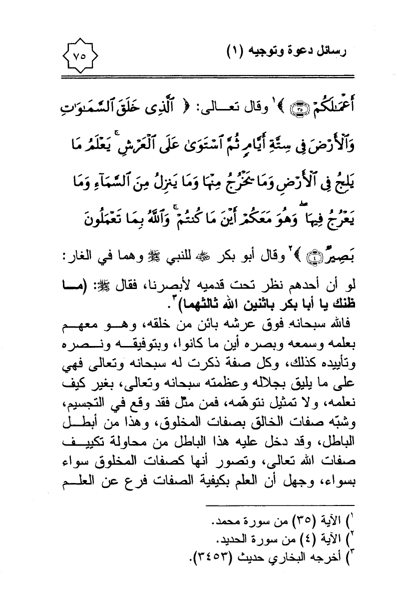 أَعْمَالَكُمْ} (¬1) وقال تعالى: {هُوَ الَّذِي خَلَقَ السَّمَاوَاتِ وَالْأَرْضَ فِي سِتَّةِ أَيَّامٍ ثُمَّ اسْتَوَى عَلَى الْعَرْشِ يَعْلَمُ مَا يَلِجُ فِي الْأَرْضِ وَمَا يَخْرُجُ مِنْهَا وَمَا يَنْزِلُ مِنَ السَّمَاءِ وَمَا يَعْرُجُ فِيهَا وَهُوَ مَعَكُمْ أَيْنَ مَا كُنْتُمْ وَاللَّهُ بِمَا تَعْمَلُونَ بَصِيرٌ} (¬2) وقال أبو بكر - رضي الله عنه - للنبي - صلى الله عليه وسلم - وهما في الغار: لو أن أحدهم نظر تحت قدميه لأبصرنا، فقال - صلى الله عليه وسلم -: (ما ظنك يا أبا بكر باثنين الله ثالثهما) (¬3).