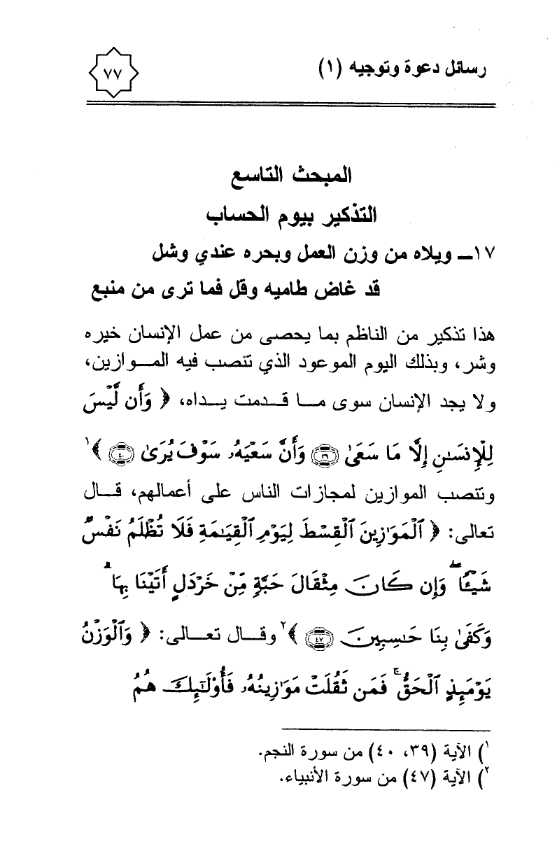 هذا تذكير من الناظم بما يحصى من عمل الإنسان خيره وشر، وبذلك اليوم الموعود الذي تنصب فيه الموازين، ولا يجد الإنسان سوى ما قدمت يداه، {وَأَنْ لَيْسَ لِلْإِنْسَانِ إِلَّا مَا سَعَى (39) وَأَنَّ سَعْيَهُ سَوْفَ يُرَى} (¬1)، وتنصب الموازين لمجازات الناس على أعمالهم، قال تعالى: {وَنَضَعُ الْمَوَازِينَ الْقِسْطَ لِيَوْمِ الْقِيَامَةِ فَلَا تُظْلَمُ نَفْسٌ شَيْئًا وَإِنْ كَانَ مِثْقَالَ حَبَّةٍ مِنْ خَرْدَلٍ أَتَيْنَا بِهَا وَكَفَى بِنَا حَاسِبِينَ} (¬2)، وقال تعالى: {وَالْوَزْنُ يَوْمَئِذٍ الْحَقُّ فَمَنْ ثَقُلَتْ مَوَازِينُهُ فَأُولَئِكَ هُمُ