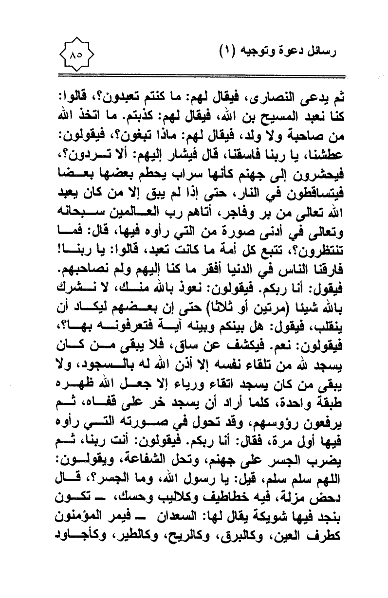 ثم يدعى النصارى، فيقال لهم: ما كنتم تعبدون؟ ، قالوا: كنا نعبد المسيح بن الله، فيقال لهم: كذبتم.