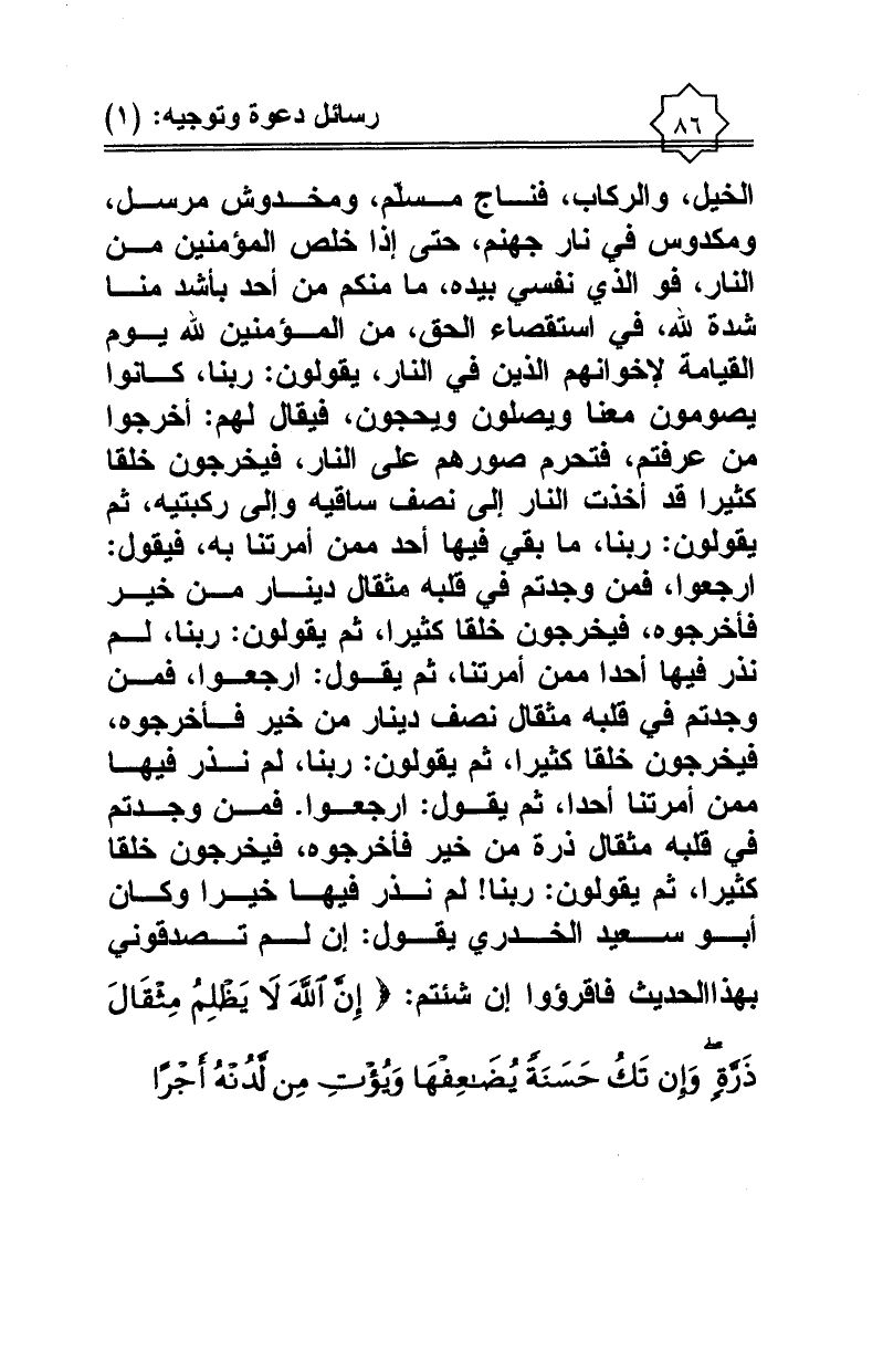 الخيل، والركاب، فناج مسلّم، ومخدوش مرسل، ومكدوس في نار جهنم، حتى إذا خلص المؤمنين من النار، فو الذي نفسي بيده، ما منكم من أحد بأشد منا شدة لله، في استقصاء الحق، من المؤمنين لله يوم القيامة لإخوانهم الذين في النار، يقولون: ربنا، كانوا يصومون معنا ويصلون ويحجون، فيقال لهم: أخرجوا من عرفتم، فتحرم صورهم على النار، فيخرجون خلقا كثيرا قد أخذت النار إلى نصف ساقيه وإلى ركبتيه، ثم يقولون: ربنا، ما بقي فيها أحد ممن أمرتنا به، فيقول: ارجعوا، فمن وجدتم في قلبه مثقال دينار من خير فأخرجوه، فيخرجون خلقا كثيرا، ثم يقولون: ربنا، لم نذر فيها أحدا ممن أمرتنا، ثم يقول: ارجعوا، فمن وجدتم في قلبه مثقال نصف دينار من خير فأخرجوه، فيخرجون خلقا كثيرا، ثم يقولون: ربنا، لم نذر فيها ممن أمرتنا أحدا، ثم يقول: ارجعوا فمن وجدتم في قلبه مثقال ذرة من خير فأخرجوه، فيخرجون خلقا كثيرا، ثم يقولون: ربنا! لم نذر فيها خيرا) وكان أبو سعيد الخدري يقول: إن لم تصدقوني بهذا الحديث فاقرؤوا إن شئتم: {إِنَّ اللَّهَ لَا يَظْلِمُ مِثْقَالَ ذَرَّةٍ وَإِنْ تَكُ حَسَنَةً يُضَاعِفْهَا وَيُؤْتِ مِنْ لَدُنْهُ أَجْرًا