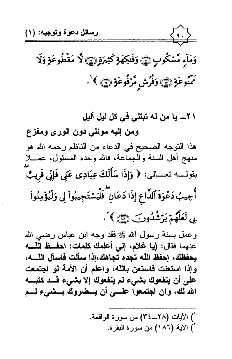 هذا التوجه الصحيح في الدعاء من الناظم رحمه الله هو منهج أهل السنة والجماعة، فالله وحده المسئول، عملا بقوله تعالى: {وَإِذَا سَأَلَكَ عِبَادِي عَنِّي فَإِنِّي قَرِيبٌ أُجِيبُ دَعْوَةَ الدَّاعِ إِذَا دَعَانِ فَلْيَسْتَجِيبُوا لِي وَلْيُؤْمِنُوا بِي لَعَلَّهُمْ يَرْشُدُونَ} (¬2). وعمل بسنة رسول الله - صلى الله عليه وسلم - فقد وجه ابن عباس رضي الله عنهما فقال: (يا غلام، إني أعلمك كلمات: احفظ الله يحفظك، إحفظ الله تجده تجاهك، إذا سألت فاسأل الله، وإذا استعنت فاستعن بالله، واعلم أن الأمة لو اجتمعت على أن ينفعوك بشيء لم ينفعوك إلا بشيء قد كتبه الله لك، وان اجتمعوا على أن يضروك بشيء لم