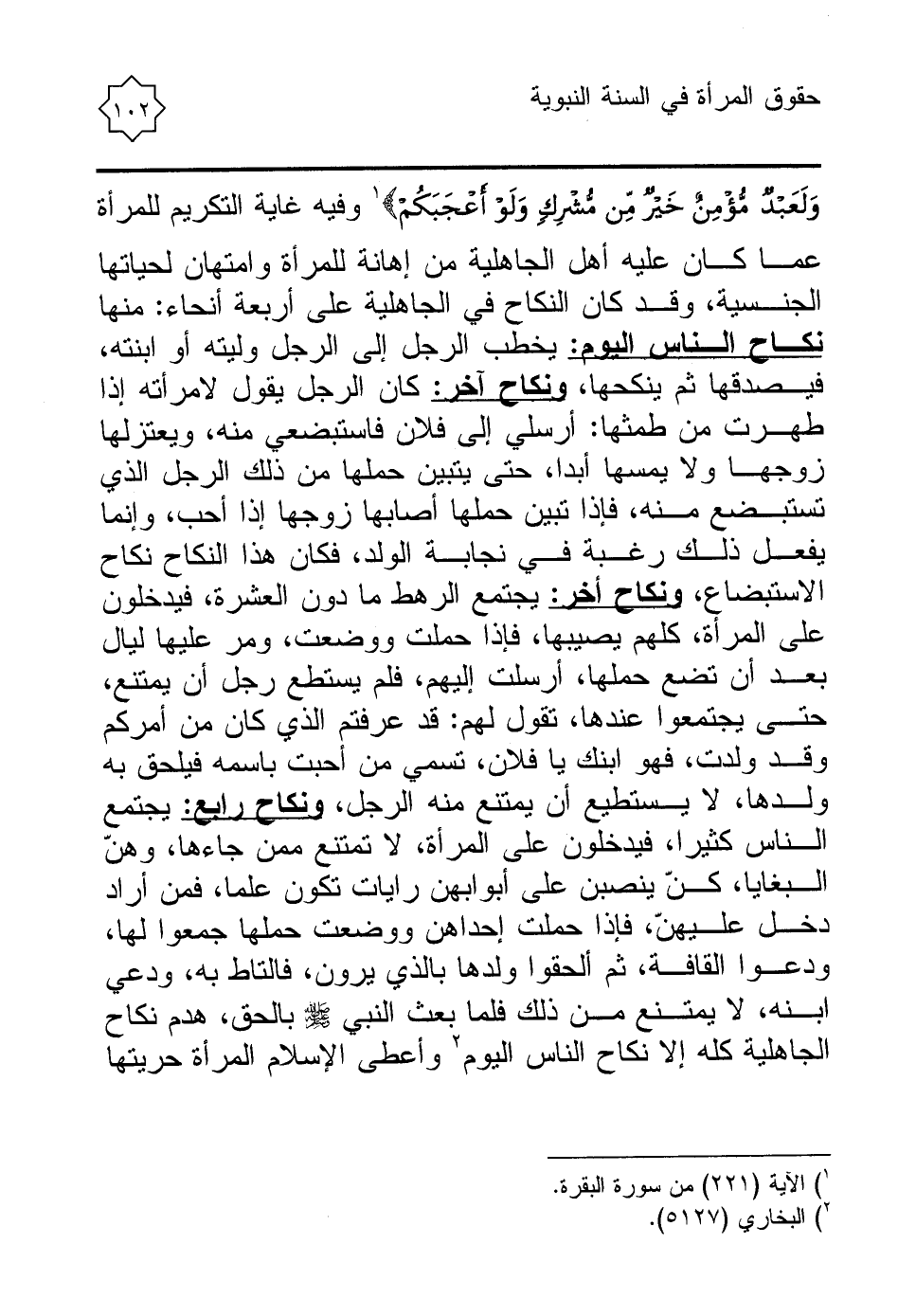 وَلَعَبْدٌ مُؤْمِنٌ خَيْرٌ مِنْ مُشْرِكٍ وَلَوْ أَعْجَبَكُمْ} (¬1) وفيه غاية التكريم للمرأة عما كان عليه أهل الجاهلية من إهانة للمرأة وامتهان لحياتها الجنسية، وقد كان النكاح في الجاهلية على أربعة أنحاء: منها نكاح الناس اليوم: يخطب الرجل إلى الرجل وليته أو ابنته، فيصدقها ثم ينكحها، ونكاح آخر: كان الرجل يقول لامرأته إذا طهرت من طمثها: أرسلي إلى فلان فاستبضعي منه، ويعتزلها زوجها ولا يمسها أبدا، حتى يتبين حملها من ذلك الرجل الذي تستبضع منه، فإذا تبين حملها أصابها زوجها إذا أحب، وإنما يفعل ذلك رغبة في نجابة الولد، فكان هذا النكاح نكاح الاستبضاع، ونكاح أخر: يجتمع الرهط ما دون العشرة، فيدخلون على المرأة، كلهم يصيبها، فإذا حملت ووضعت، ومر عليها ليال بعد أن تضع حملها، أرسلت إليهم، فلم يستطع رجل أن يمتنع، حتى يجتمعوا عندها، تقول لهم: قد عرفتم الذي كان من أمركم وقد ولدت، فهو ابنك يا فلان، تسمي من أحبت باسمه فيلحق به ولدها، لا يستطيع أن يمتنع منه الرجل، ونكاح رابع: يجتمع الناس كثيرا، فيدخلون على المرأة، لا تمتنع ممن جاءها، وهنّ البغايا، كنّ ينصبن على أبوابهن رايات تكون علما، فمن أراد دخل عليهنّ، فإذا حملت إحداهن ووضعت حملها جمعوا لها، ودعوا القافة، ثم ألحقوا ولدها بالذي يرون، فالتاط به، ودعي ابنه، لا يمتنع من ذلك فلما بعث النبي - صلى الله عليه وسلم - بالحق، هدم نكاح الجاهلية كله إلا نكاح الناس اليوم (¬2) وأعطى الإسلام المرأة حريتها