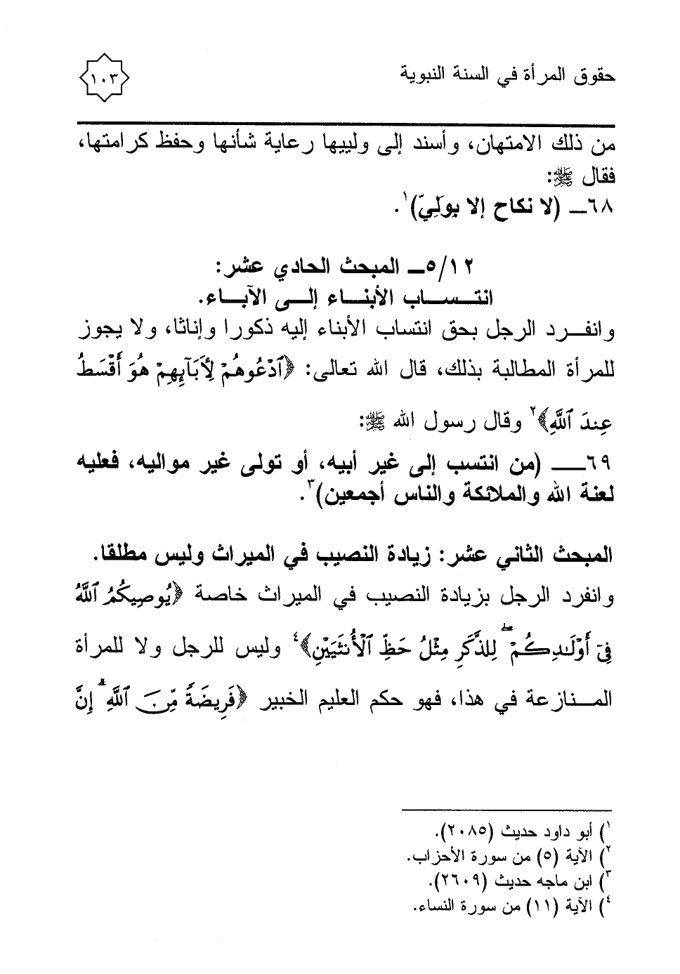 وانفرد الرجل بحق انتساب الأبناء إليه ذكورا وإناثا، ولا يجوز للمرأة المطالبة بذلك، قال الله تعالى: {ادْعُوهُمْ لِآبَائِهِمْ هُوَ أَقْسَطُ عِنْدَ اللَّهِ} (¬2) وقال رسول الله - صلى الله عليه وسلم -: