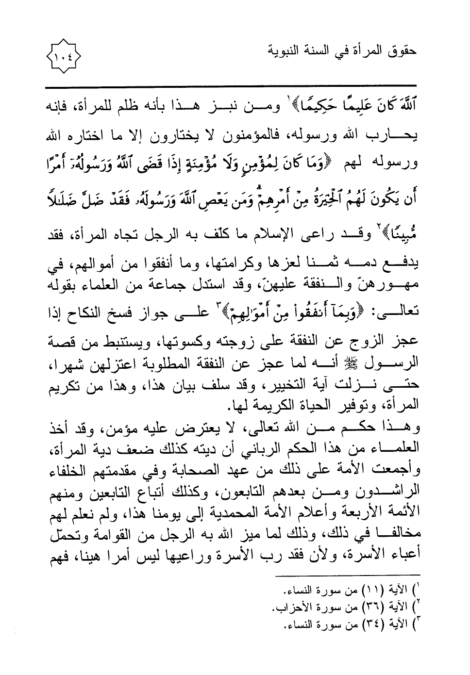 اللَّهَ كَانَ عَلِيمًا حَكِيمًا} (¬1) ومن نبز هذا بأنه ظلم للمرأة، فإنه يحارب الله ورسوله، فالمؤمنون لا يختارون إلا ما اختاره الله ورسوله لهم {وَمَا كَانَ لِمُؤْمِنٍ وَلَا مُؤْمِنَةٍ إِذَا قَضَى اللَّهُ وَرَسُولُهُ أَمْرًا أَنْ يَكُونَ لَهُمُ الْخِيَرَةُ مِنْ أَمْرِهِمْ وَمَنْ يَعْصِ اللَّهَ وَرَسُولَهُ فَقَدْ ضَلَّ ضَلَالًا مُبِينًا} (¬2) وقد راعى الإسلام ما كلّف به الرجل تجاه المرأة، فقد يدفع دمه ثمنا لعزها وكرامتها، وما أنفقوا من أموالهم، في مهورهنّ والنفقة عليهنّ، وقد استدل جماعة من العلماء بقوله تعالى: {وَبِمَا أَنْفَقُوا مِنْ أَمْوَالِهِمْ} (¬3) على جواز فسخ النكاح إذا عجز الزوج عن النفقة على زوجته وكسوتها، ويستنبط من قصة الرسول - صلى الله عليه وسلم - أنه لما عجز عن النفقة المطلوبة اعتزلهن شهرا، حتى نزلت آية التخيير، وقد سلف بيان هذا، وهذا من تكريم المرأة، وتوفير الحياة الكريمة لها.