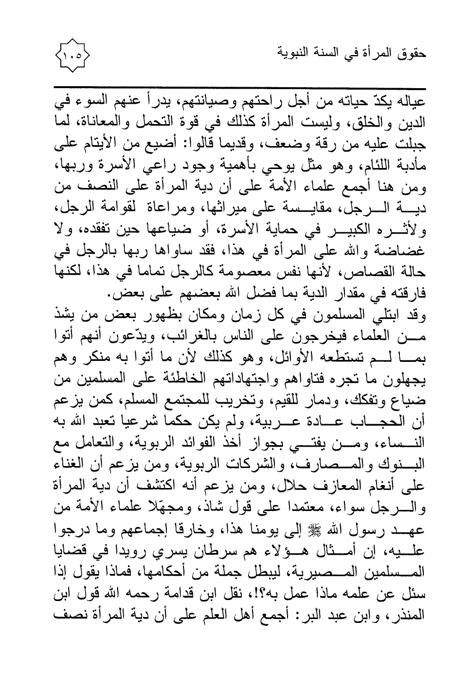 عياله يكدّ حياته من أجل راحتهم وصيانتهم، يدرأ عنهم السوء في الدين والخلق، وليست المرأة كذلك في قوة التحمل والمعاناة، لما جبلت عليه من رقة وضعف، وقديما قالوا: أضيع من الأيتام على مأدبة اللئام، وهو مثل يوحي بأهمية وجود راعي الأسرة وربها، ومن هنا أجمع علماء الأمة على أن دية المرأة على النصف من دية الرجل، مقايسة على ميراثها، ومراعاة لقوامة الرجل، ولأثره الكبير في حماية الأسرة، أو ضياعها حين تفقده، ولا غضاضة والله على المرأة في هذا، فقد ساواها ربها بالرجل في حالة القصاص، لأنها نفس معصومة كالرجل تماما في هذا، لكنها فارقته في مقدار الدية بما فضل الله بعضهم على بعض.