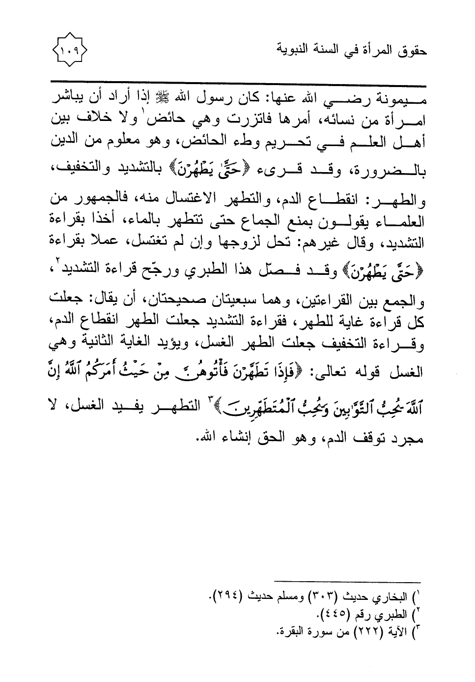 ميمونة رضي الله عنها: كان رسول الله - صلى الله عليه وسلم - إذا أراد أن يباشر امرأة من نسائه، أمرها فاتزرت وهي حائض (¬1) ولا خلاف بين أهل العلم في تحريم وطء الحائض، وهو معلوم من الدين بالضرورة، وقد قرئ {يَطْهُرْنَ} بالتشديد والتخفيف، والطهر: انقطاع الدم، والتطهر الاغتسال منه، فالجمهور من العلماء يقولون بمنع الجماع حتى تتطهر بالماء، أخذا بقراءة التشديد، وقال غيرهم: تحل لزوجها وإن لم تغتسل، عملا بقراءة {حَتَّى يَطْهُرْنَ} وقد فصّل هذا الطبري ورجّح قراءة التشديد (¬2)، والجمع بين القراءتين، وهما سبعيتان صحيحتان، أن يقال: جعلت كل قراءة غاية للطهر، فقراءة التشديد جعلت الطهر انقطاع الدم، وقراءة التخفيف جعلت الطهر الغسل، ويؤيد الغاية الثانية وهي الغسل قوله تعالى: {فَإِذَا تَطَهَّرْنَ فَأْتُوهُنَّ مِنْ حَيْثُ أَمَرَكُمُ اللَّهُ إِنَّ اللَّهَ يُحِبُّ التَّوَّابِينَ وَيُحِبُّ الْمُتَطَهِّرِينَ} (¬3) التطهر يفيد الغسل، لا مجرد توقف الدم، وهو الحق إنشاء الله.