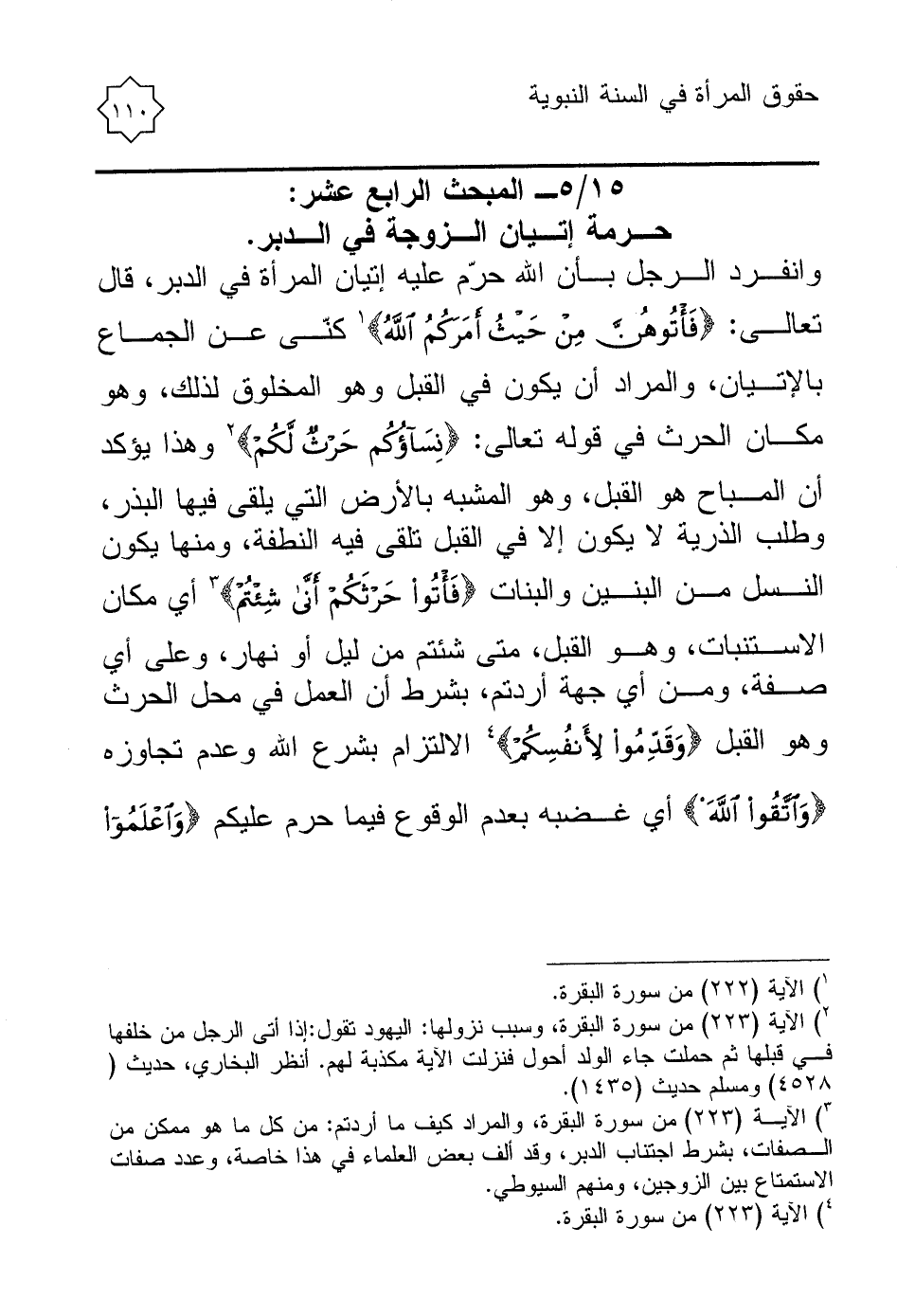 (¬2) من الآية (223) من سورة البقرة، والمراد كيف ما أردتم: من كل ما هو ممكن من الصفات، بشرط اجتناب الدبر، وقد ألف بعض العلماء في هذا خاصة، وعدد صفات الاستمتاع بين الزوجين، ومنهم السيوطي.