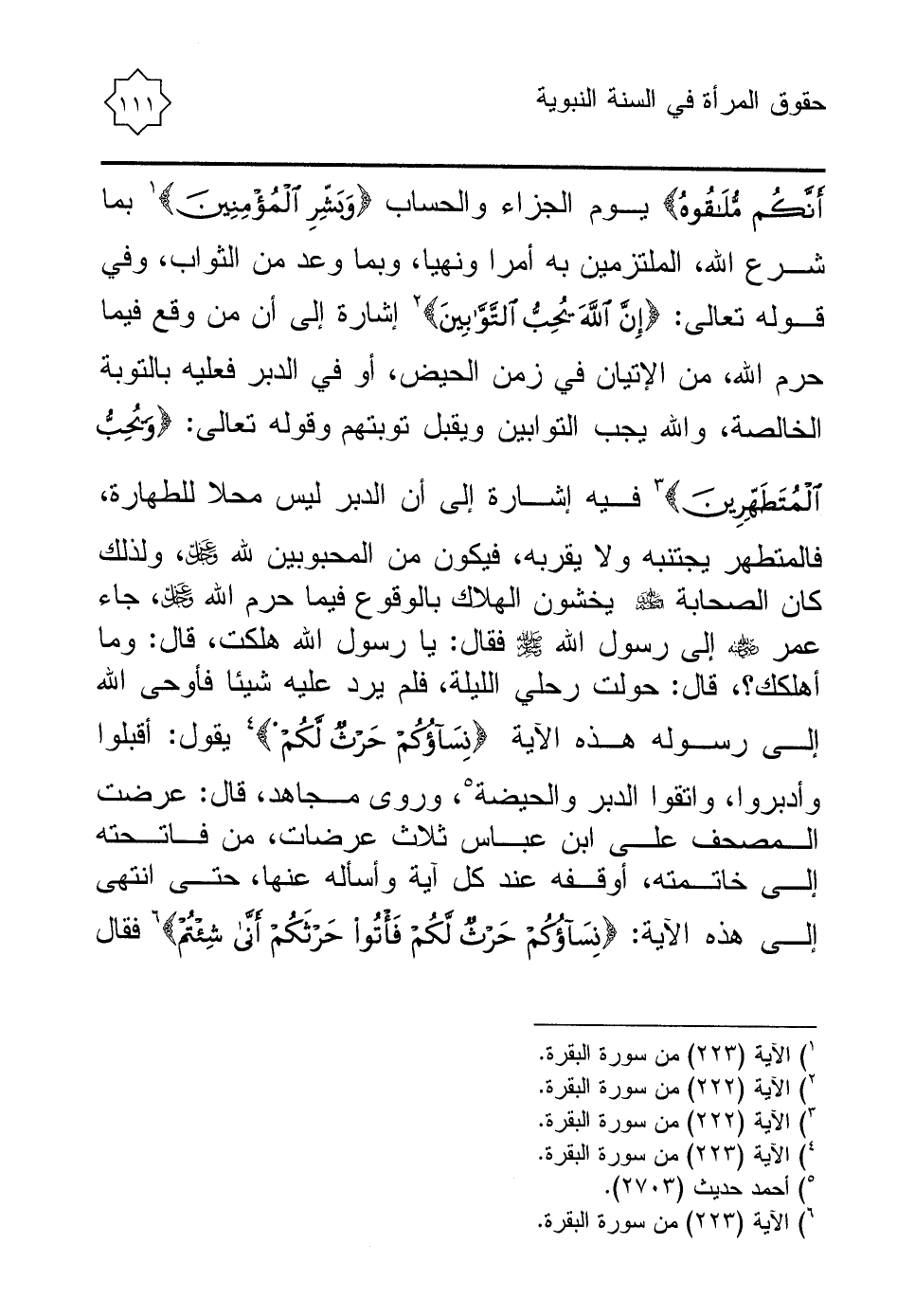 أَنَّكُمْ مُلَاقُوهُ} يوم الجزاء والحساب {وَبَشِّرِ الْمُؤْمِنِينَ} (¬1) بما شرع الله، الملتزمين به أمرا ونهيا، وبما وعد من الثواب، وفي قوله تعالى: {إِنَّ اللَّهَ يُحِبُّ التَّوَّابِينَ} (¬2) إشارة إلى أن من وقع فيما حرم الله، من الإتيان في زمن الحيض، أو في الدبر فعليه بالتوبة الخالصة، والله يجب التوابين ويقبل توبتهم وقوله تعالى: {وَيُحِبُّ الْمُتَطَهِّرِينَ} (¬3) فيه إشارة إلى أن الدبر ليس محلا للطهارة، فالمتطهر يجتنبه ولا يقربه، فيكون من المحبوبين لله - عز وجل -، ولذلك كان الصحابة صدق الله العظيم يخشون الهلاك بالوقوع فيما حرم الله - عز وجل -، جاء عمر - رضي الله عنه - إلى رسول الله - صلى الله عليه وسلم - فقال: يا رسول الله هلكت، قال: وما أهلكك؟ ، قال: حولت رحلي الليلة، فلم يرد عليه شيئا فأوحى الله إلى رسوله هذه الآية {نِسَاؤُكُمْ حَرْثٌ لَكُمْ} (¬4) يقول: أقبلوا وأدبروا، واتقوا الدبر والحيضة (¬5)، وروى مجاهد, قال: عرضت المصحف على ابن عباس ثلاث عرضات، من فاتحته إلى خاتمته، أوقفه عند كل آية وأسأله عنها, حتى انتهى إلى هذه الآية: {نِسَاؤُكُمْ حَرْثٌ لَكُمْ فَأْتُوا حَرْثَكُمْ أَنَّى شِئْتُمْ} (¬6) فقال
