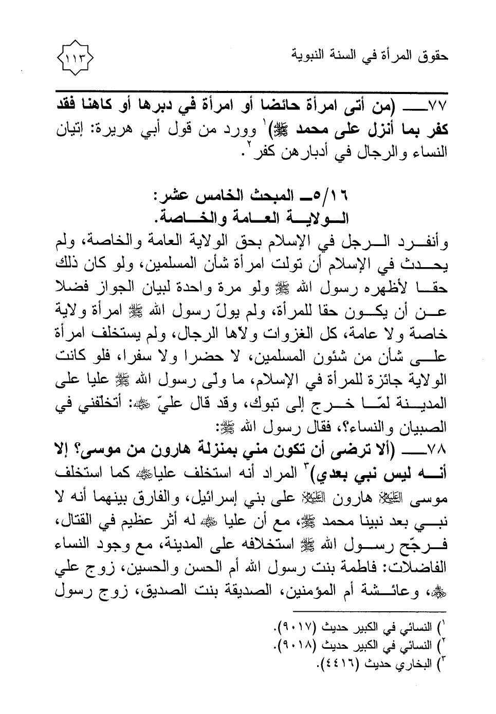 وأنفرد الرجل في الإسلام بحق الولاية العامة والخاصة، ولم يحدث في الإسلام أن تولت امرأة شأن المسلمين، ولو كان ذلك حقا لأظهره رسول الله - صلى الله عليه وسلم - ولو مرة واحدة لبيان الجواز فضلا عن أن يكون حقا للمرأة، ولم يولّ رسول الله - صلى الله عليه وسلم - امرأة ولاية خاصة ولا عامة، كل الغزوات ولاّها الرجال، ولم يستخلف امرأة على شأن من شئون المسلمين، لا حضرا ولا سفرا، فلو كانت الولاية جائزة للمرأة في الإسلام، ما ولّى رسول الله - صلى الله عليه وسلم - عليا على المدينة لمّا خرج إلى تبوك، وقد قال عليّ - رضي الله عنه -: أتخلّفني في الصبيان والنساء؟ ، فقال رسول الله - صلى الله عليه وسلم -: