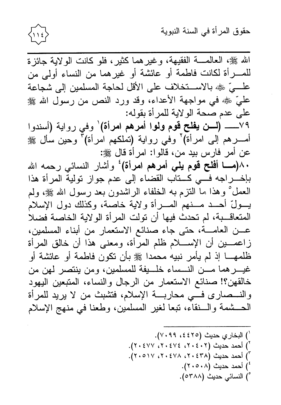 80 (ما أفلح قوم يلي أمرهم امرأة) (¬4) وأشار النسائي رحمه الله بإخراجه في كتاب القضاء إلى عدم جواز تولية المرأة هذا العمل (¬5) وهذا ما التزم به الخلفاء الراشدون بعد رسول الله - صلى الله عليه وسلم -، ولم يولّ أحد منهم المرأة ولاية خاصة، وكذلك دول الإسلام المتعاقبة، لم تحدث فيها أن تولت المرأة الولاية الخاصة فضلا عن العامة، حتى جاء صنائع الاستعمار من أبناء المسلمين، زاعمين أن الإسلام ظلم المرأة، ومعنى هذا أن خالق المرأة ظلمها إذ لم يأمر نبيه محمدا - صلى الله عليه وسلم - بأن تكون فاطمة أو عائشة أو غيرهما من النساء خليفة للمسلمين، ومن ينتصر لهن من خالقهن؟ ! صنائع الاستعمار من الرجال والنساء، المتبعين اليهود والنصارى في محاربة الإسلام، فتشبث من لا يريد للمرأة الحشمة والنقاء، تبعا لغير المسلمين، وطعنا في منهج الإسلام