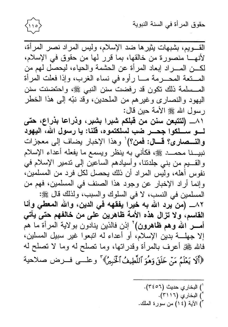 القويم، بشبهات يثيرها ضد الإسلام، وليس المراد نصر المرأة، لأنها منصورة من خالقها، بما قرر لها من حقوق في الإسلام، لكن المراد إبعاد المرأة عن الحشمة والحياء، ليحصل لهم من المتعة المحرمة ما رأوه في نساء الغرب، وإذا فعلت المرأة المسلمة ذلك تكون قد رفضت سنن النبي - صلى الله عليه وسلم -، واحتضنت سنن اليهود والنصارى وغيرهم من الملحدين، وقد نبّه إلى هذا الخطر رسول الله - صلى الله عليه وسلم - الأمة حين قال: