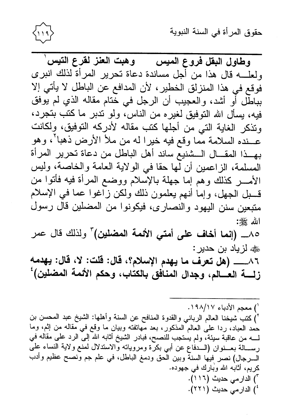 (¬2) كتب شيخنا العالم الرباني والقدوة المنافح عن السنة وأهلها: الشيخ عبد المحسن بن حمد العباد، ردا على العالم المذكور، بعد مهاتفته وبيان ما وقع في مقاله من إثم، وما له من عاقبة سيئة، ولم يستجب للنصح، فبادر الشيخ أثابه الله إلى الرد على مقاله في رسالة بعنوان (الدفاع عن أبي بكرة ومروياته والاستدلال لمنع ولاية النساء على الرجال) نصر فيها السنة وبين الحق ودمغ الباطل، في علم جم ونصح عظيم وأدب كريم، أثابه الله وبارك في جهوده.