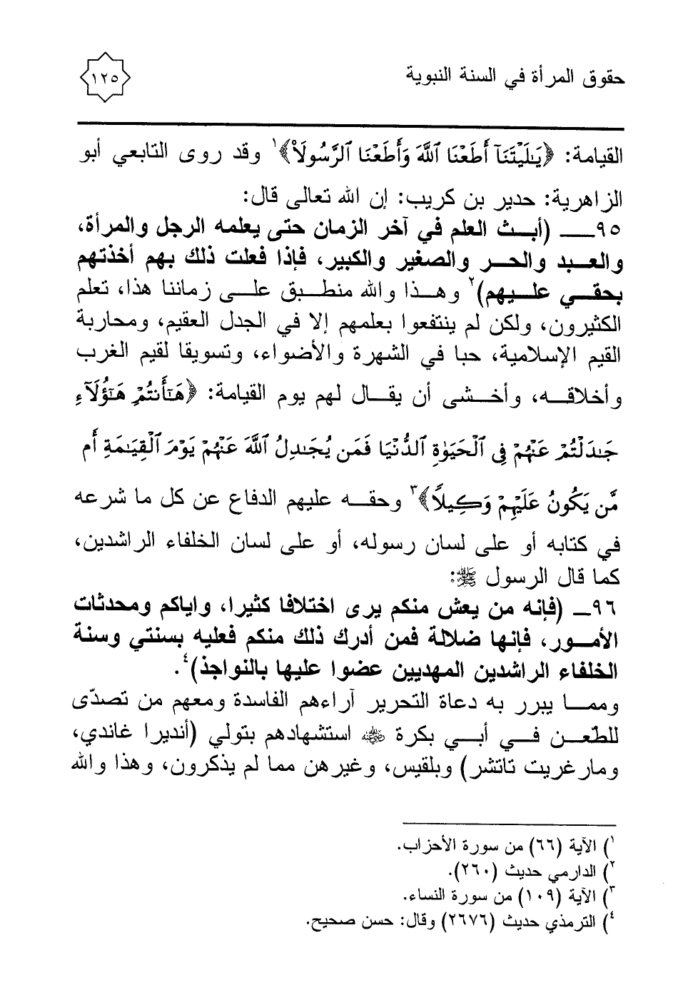 96 - (فإنه من يعش منكم يرى اختلافا كثيرا، واياكم ومحدثات الأمور، فإنها ضلالة فمن أدرك ذلك منكم فعليه بسنتي وسنة الخلفاء الراشدين المهديين عضوا عليها بالنواجذ) (¬4). ومما يبرر به دعاة التحرير آراءهم الفاسدة ومعهم من تصدّى للطّعن في أبي بكرة - رضي الله عنه - استشهادهم بتولي "أنديرا غاندي، ومارغريت تاتشر" وبلقيس، وغيرهن مما لم يذكرون، وهذا والله