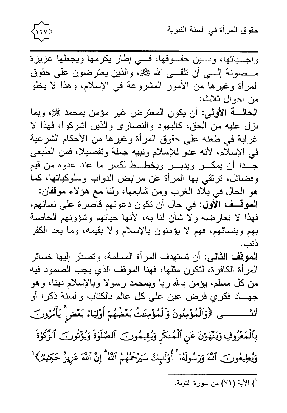 واجباتها، وبين حقوقها، في إطار يكرمها ويجعلها عزيزة مصونة إلى أن تلقى الله - عز وجل -، والذين يعترضون على حقوق المرأة وغيرها من الأمور المشروعة في الإسلام، وهذا لا يخلو من أحوال ثلاث: