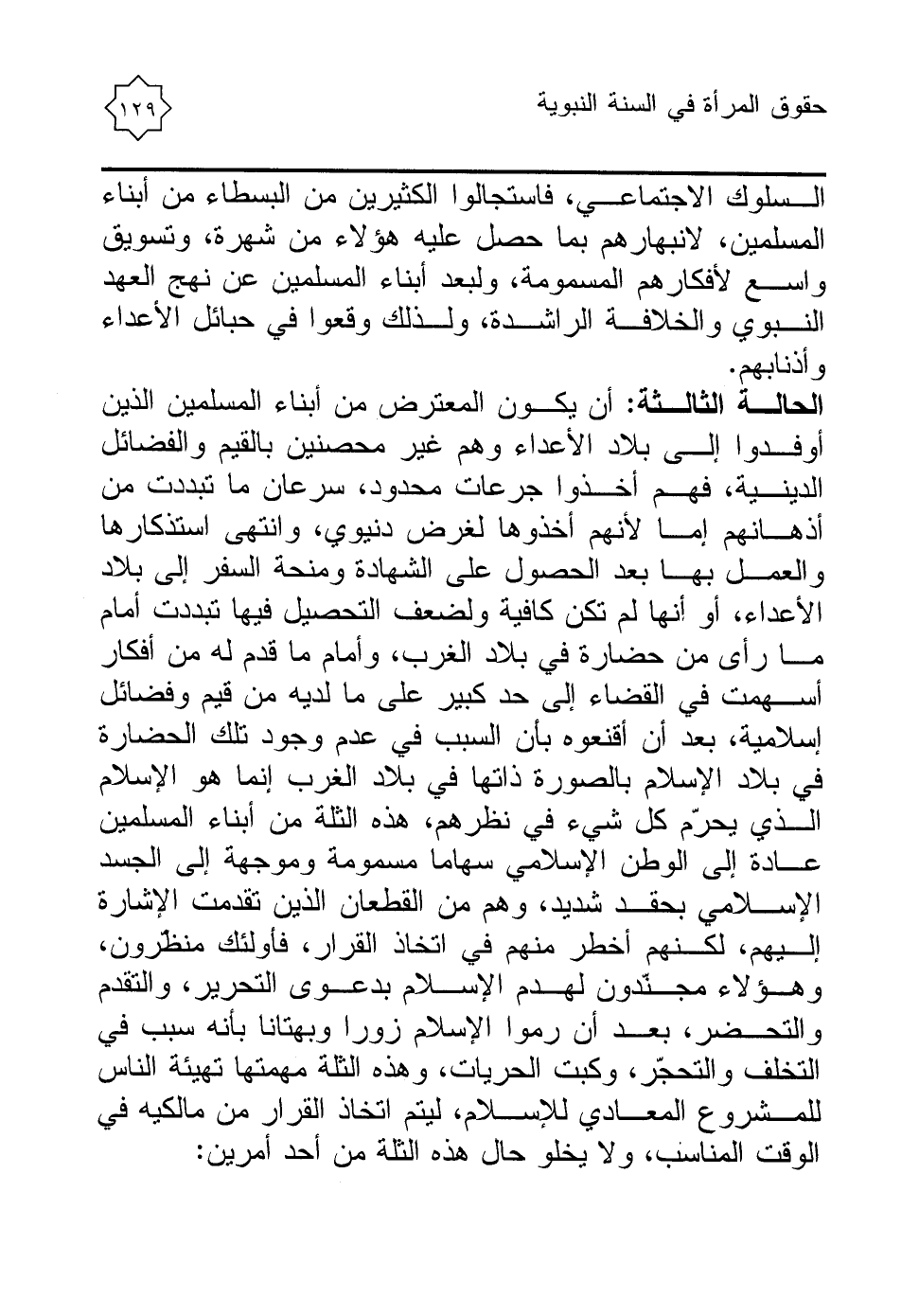 الحالة الثالثة: أن يكون المعترض من أبناء المسلمين الذين أوفدوا إلى بلاد الأعداء وهم غير محصنين بالقيم والفضائل الدينية، فهم أخذوا جرعات محدود، سرعان ما تبددت من أذهانهم إما لأنهم أخذوها لغرض دنيوي، وانتهى استذكارها والعمل بها بعد الحصول على الشهادة ومنحة السفر إلى بلاد الأعداء، أو أنها لم تكن كافية ولضعف التحصيل فيها تبددت أمام ما رأى من حضارة في بلاد الغرب، وأمام ما قدم له من أفكار أسهمت في القضاء إلى حد كبير على ما لديه من قيم وفضائل إسلامية، بعد أن أقنعوه بأن السبب في عدم وجود تلك الحضارة في بلاد الإسلام بالصورة ذاتها في بلاد الغرب إنما هو الإسلام الذي يحرّم كل شيء في نظرهم، هذه الثلة من أبناء المسلمين عادة إلى الوطن الإسلامي سهاما مسمومة وموجهة إلى الجسد الإسلامي بحقد شديد، وهم من القطعان الذين تقدمت الإشارة إليهم، لكنهم أخطر منهم في اتخاذ القرار، فأولئك منظّرون، وهؤلاء مجنّدون لهدم الإسلام بدعوى التحرير، والتقدم والتحضر، بعد أن رموا الإسلام زورا وبهتانا بأنه سبب في التخلف والتحجّر، وكبت الحريات، وهذه الثلة مهمتها تهيئة الناس للمشروع المعادي للإسلام، ليتم اتخاذ القرار من مالكيه في الوقت المناسب، ولا يخلو حال هذه الثلة من أحد أمرين: