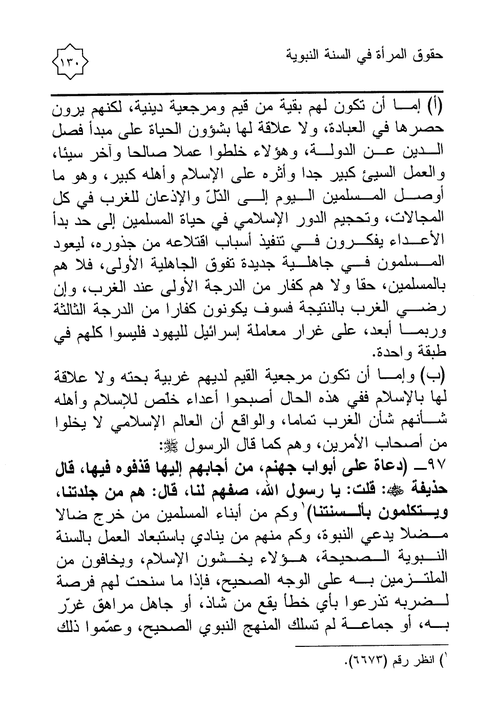 97 - (دعاة على أبواب جهنم، من أجابهم إليها قذفوه فيها، قال حذيفة - رضي الله عنه -: قلت: يا رسول الله، صفهم لنا، قال: هم من جلدتنا، ويتكلمون بألسنتنا) (¬1) وكم من أبناء المسلمين من خرج ضالا مضلا يدعي النبوة، وكم منهم من ينادي باستبعاد العمل بالسنة النبوية الصحيحة، هؤلاء يخشون الإسلام، ويخافون من الملتزمين به على الوجه الصحيح، فإذا ما سنحت لهم فرصة لضربه تذرعوا بأي خطأ يقع من شاذ، أو جاهل مراهق غرّر به، أو جماعة لم تسلك المنهج النبوي الصحيح، وعمّموا ذلك