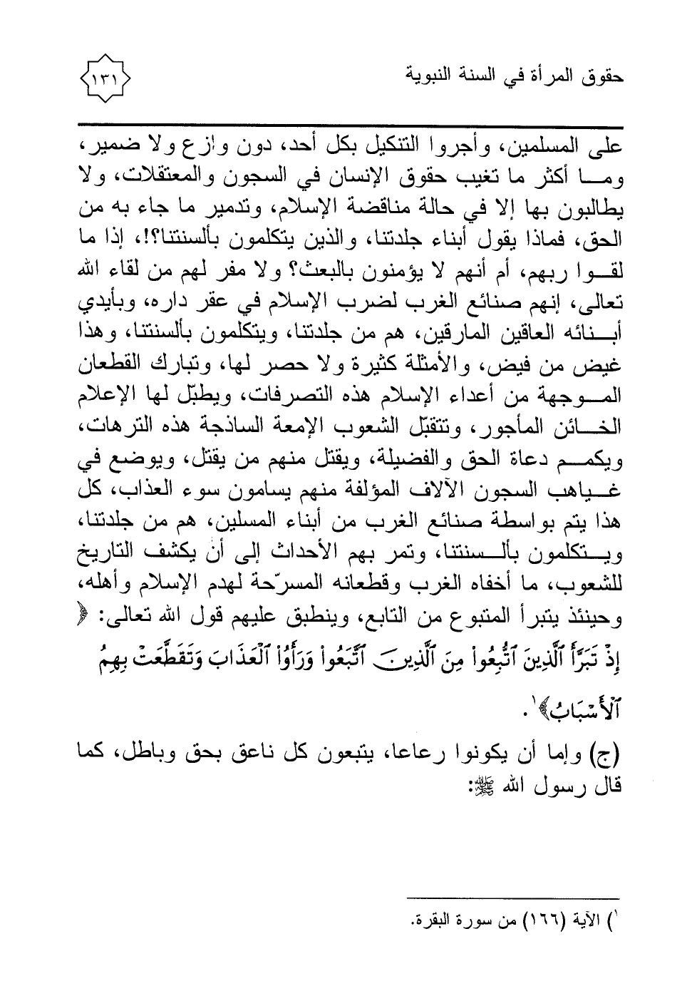 على المسلمين، وأجروا التنكيل بكل أحد، دون وازع ولا ضمير، وما أكثر ما تغيب حقوق الإنسان في السجون والمعتقلات، ولا يطالبون بها إلا في حالة مناقضة الإسلام، وتدمير ما جاء به من الحق، فماذا يقول أبناء جلدتنا، والذين يتكلمون بألسنتنا؟ ! ، إذا ما لقوا ربهم، أم أنهم لا يؤمنون بالبعث؟ ولا مفر لهم من لقاء الله تعالى، إنهم صنائع الغرب لضرب الإسلام في عقر داره، وبأيدي أبنائه العاقين المارقين، هم من جلدتنا، ويتكلمون بألسنتنا، وهذا غيض من فيض، والأمثلة كثيرة ولا حصر لها، وتبارك القطعان الموجهة من أعداء الإسلام هذه التصرفات، ويطبّل لها الإعلام الخائن المأجور، وتتقبّل الشعوب الإمعة الساذجة هذه الترهات، ويكمم دعاة الحق والفضيلة، ويقتل منهم من يقتل، ويوضع في غياهب السجون الآلاف المؤلفة منهم يسامون سوء العذاب، كل هذا يتم بواسطة صنائع الغرب من أبناء المسلين، هم من جلدتنا، ويتكلمون بألسنتنا، وتمر بهم الأحداث إلى أن يكشف التاريخ للشعوب، ما أخفاه الغرب وقطعانه المسرّحة لهدم الإسلام وأهله، وحينئذ يتبرأ المتبوع من التابع، وينطبق عليهم قول الله تعالى: {إِذْ تَبَرَّأَ الَّذِينَ اتُّبِعُوا مِنَ الَّذِينَ اتَّبَعُوا وَرَأَوُا الْعَذَابَ وَتَقَطَّعَتْ بِهِمُ الْأَسْبَابُ} (¬1).