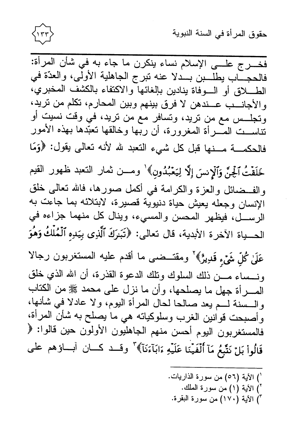 فخرج على الإسلام نساء ينكرن ما جاء به في شأن المرأة: فالحجاب يطلبن بدلا عنه تبرج الجاهلية الأولى، والعدّة في الطلاق أو الوفاة ينادين بإلغائها والاكتفاء بالكشف المخبري، والأجانب عندهن لا فرق بينهم وبين المحارم، تكلم من تريد، وتجلس مع من تريد، وتسافر مع من تريد، في وقت نسيت أو تناست المرأة المغرورة، أن ربها وخالقها تعبّدها بهذه الأمور فالحكمة منها قبل كل شيء التعبد لله لأنه تعالى يقول: {وَمَا خَلَقْتُ الْجِنَّ وَالْإِنْسَ إِلَّا لِيَعْبُدُونِ} (¬1) ومن ثمار التعبد ظهور القيم والفضائل والعزة والكرامة في أكمل صورها، فالله تعالى خلق الإنسان وجعله يعيش حياة دنيوية قصيرة، لابتلائه بما جاءت به الرسل، فيظهر المحسن والمسيء، وينال كل منهما جزاءه في الحياة الآخرة الأبدية، قال تعالى: {تَبَارَكَ الَّذِي بِيَدِهِ الْمُلْكُ وَهُوَ عَلَى كُلِّ شَيْءٍ قَدِيرٌ} (¬2) ومقتضى ما أقدم عليه المستغربون رجالا ونساء من ذلك السلوك وتلك الدعوة القذرة، أن الله الذي خلق المرأة جهل ما يصلحها، وأن ما نزل على محمد - صلى الله عليه وسلم - من الكتاب والسنة لم يعد صالحا لحال المرأة اليوم، ولا عادلا في شأنها، وأصبحت قوانين الغرب وسلوكياته هي ما يصلح به شأن المرأة، فالمستغربون اليوم أحسن منهم الجاهليون الأولون حين قالوا: {وَإِذَا قِيلَ لَهُمُ اتَّبِعُوا مَا أَنْزَلَ اللَّهُ قَالُوا بَلْ نَتَّبِعُ مَا أَلْفَيْنَا عَلَيْهِ آبَاءَنَا} (¬3) وقد كان آباؤهم على