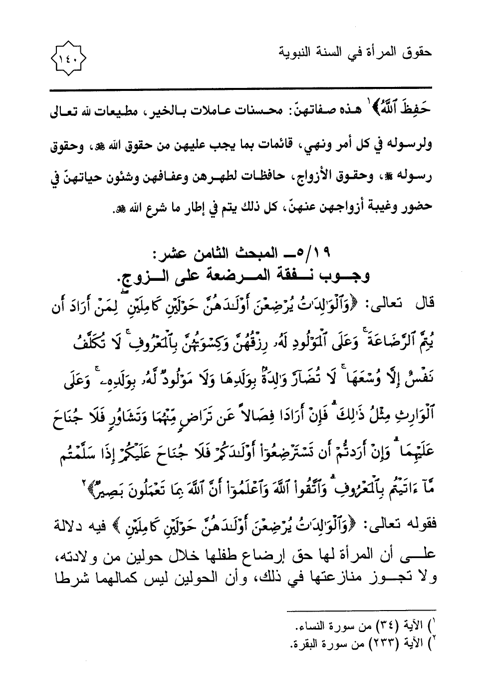 قال تعالى: {وَالْوَالِدَاتُ يُرْضِعْنَ أَوْلَادَهُنَّ حَوْلَيْنِ كَامِلَيْنِ لِمَنْ أَرَادَ أَنْ يُتِمَّ الرَّضَاعَةَ وَعَلَى الْمَوْلُودِ لَهُ رِزْقُهُنَّ وَكِسْوَتُهُنَّ بِالْمَعْرُوفِ لَا تُكَلَّفُ نَفْسٌ إِلَّا وُسْعَهَا لَا تُضَارَّ وَالِدَةٌ بِوَلَدِهَا وَلَا مَوْلُودٌ لَهُ بِوَلَدِهِ وَعَلَى الْوَارِثِ مِثْلُ ذَلِكَ فَإِنْ أَرَادَا فِصَالًا عَنْ تَرَاضٍ مِنْهُمَا وَتَشَاوُرٍ فَلَا جُنَاحَ عَلَيْهِمَا وَإِنْ أَرَدْتُمْ أَنْ تَسْتَرْضِعُوا أَوْلَادَكُمْ فَلَا جُنَاحَ عَلَيْكُمْ إِذَا سَلَّمْتُمْ مَا آتَيْتُمْ بِالْمَعْرُوفِ وَاتَّقُوا اللَّهَ وَاعْلَمُوا أَنَّ اللَّهَ بِمَا تَعْمَلُونَ بَصِيرٌ} (¬2) فقوله تعالى: {وَالْوَالِدَاتُ يُرْضِعْنَ أَوْلَادَهُنَّ حَوْلَيْنِ كَامِلَيْنِ} فيه دلالة على أن المرأة لها حق إرضاع طفلها خلال حولين من ولادته، ولا تجوز منازعتها في ذلك، وأن الحولين ليس كمالهما شرطا