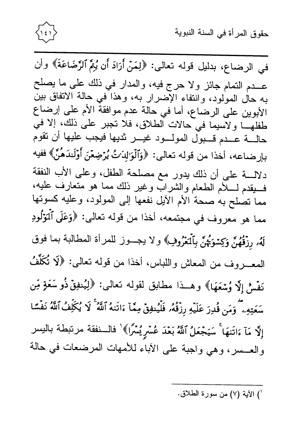 في الرضاع، بدليل قوله تعالى: {وَالْوَالِدَاتُ يُرْضِعْنَ أَوْلَادَهُنَّ حَوْلَيْنِ كَامِلَيْنِ لِمَنْ أَرَادَ أَنْ يُتِمَّ الرَّضَاعَةَ وَعَلَى الْمَوْلُودِ لَهُ رِزْقُهُنَّ وَكِسْوَتُهُنَّ بِالْمَعْرُوفِ} وأن عدم التمام جائز ولا حرج فيه، والمدار في ذلك على ما يصلح به حال المولود، وانتفاء الإضرار به، وهذا في حالة الاتفاق بين الأبوين على الرضاع، أما في حالة عدم موافقة الأم على إرضاع طفلها ولاسيما في حالات الطلاق، فلا تجبر على ذلك، إلا في حالة عدم قبول المولود غير ثديها فيجب عليها أن تقوم بإرضاعه، أخذا من قوله تعالى: {لَا تُكَلَّفُ نَفْسٌ إِلَّا وُسْعَهَا} ففيه دلالة على أن ذلك يدور مع مصلحة الطفل، وعلى الأب النفقة فيقدم للأم الطعام والشراب وغير ذلك مما هو متعارف عليه، مما تصلح به صحة الأم الآيل نفعها إلى المولود، وعليه كسوتها مما هو معروف في مجتمعه، أخذا من قوله تعالى: {وَعَلَى الْمَوْلُودِ لَهُ رِزْقُهُنَّ وَكِسْوَتُهُنَّ بِالْمَعْرُوفِ} ولا يجوز للمرأة المطالبة بما فوق المعروف من المعاش واللباس، أخذا من قوله تعالى: {لَا تُكَلَّفُ نَفْسٌ إِلَّا وُسْعَهَا} وهذا مطابق لقوله تعالى: {لِيُنْفِقْ ذُو سَعَةٍ مِنْ سَعَتِهِ وَمَنْ قُدِرَ عَلَيْهِ رِزْقُهُ فَلْيُنْفِقْ مِمَّا آتَاهُ اللَّهُ لَا يُكَلِّفُ اللَّهُ نَفْسًا إِلَّا مَا آتَاهَا سَيَجْعَلُ اللَّهُ بَعْدَ عُسْرٍ يُسْرًا} (¬1) فالنفقة مرتبطة باليسر والعسر، وهي واجبة على الآباء للأمهات المرضعات في حالة