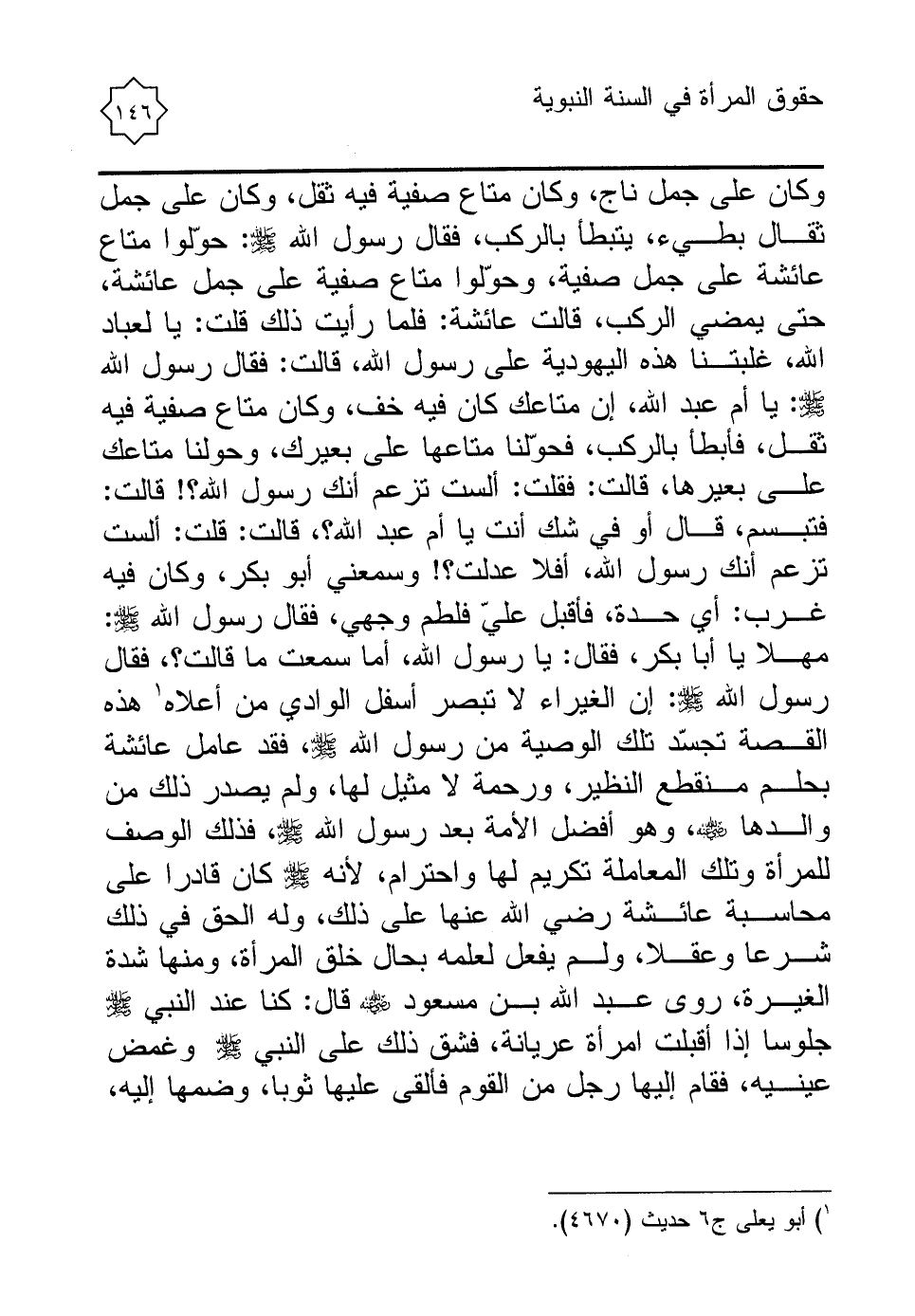 وكان على جمل ناج، وكان متاع صفية فيه ثقل، وكان على جمل ثقال بطيء، يتبطأ بالركب، فقال رسول الله - صلى الله عليه وسلم -: حوّلوا متاع عائشة على جمل صفية، وحوّلوا متاع صفية على جمل عائشة، حتى يمضي الركب، قالت عائشة: فلما رأيت ذلك قلت: يا لعباد الله، غلبتنا هذه اليهودية على رسول الله، قالت: فقال رسول الله - صلى الله عليه وسلم -: يا أم عبد الله، إن متاعك كان فيه خف، وكان متاع صفية فيه ثقل، فأبطأ بالركب، فحوّلنا متاعها على بعيرك، وحولنا متاعك على بعيرها، قالت: فقلت: ألست تزعم أنك رسول الله؟ ! قالت: فتبسم، قال أو في شك أنت يا أم عبد الله؟ ، قالت: قلت: ألست تزعم أنك رسول الله، أفلا عدلت؟ ! وسمعني أبو بكر، وكان فيه غرب: أي حدة، فأقبل عليّ فلطم وجهي، فقال رسول الله - صلى الله عليه وسلم -: مهلا يا أبا بكر، فقال: يا رسول الله، أما سمعت ما قالت؟ ، فقال رسول الله - صلى الله عليه وسلم -: إن الغيراء لا تبصر أسفل الوادي من أعلاه (¬1) هذه القصة تجسّد تلك الوصية من رسول الله - صلى الله عليه وسلم -، فقد عامل عائشة بحلم منقطع النظير، ورحمة لا مثيل لها، ولم يصدر ذلك من والدها - رضي الله عنه -، وهو أفضل الأمة بعد رسول الله - صلى الله عليه وسلم -، فذلك الوصف للمرأة وتلك المعاملة تكريم لها واحترام، لأنه - صلى الله عليه وسلم - كان قادرا على محاسبة عائشة رضي الله عنها على ذلك، وله الحق في ذلك شرعا وعقلا، ولم يفعل لعلمه بحال خلق المرأة، ومنها شدة الغيرة، روى عبد الله بن مسعود - رضي الله عنه - قال: كنا عند النبي - صلى الله عليه وسلم - جلوسا إذا أقبلت امرأة عريانة، فشق ذلك على النبي - صلى الله عليه وسلم - وغمض عينيه، فقام إليها رجل من القوم فألقى عليها ثوبا، وضمها إليه،