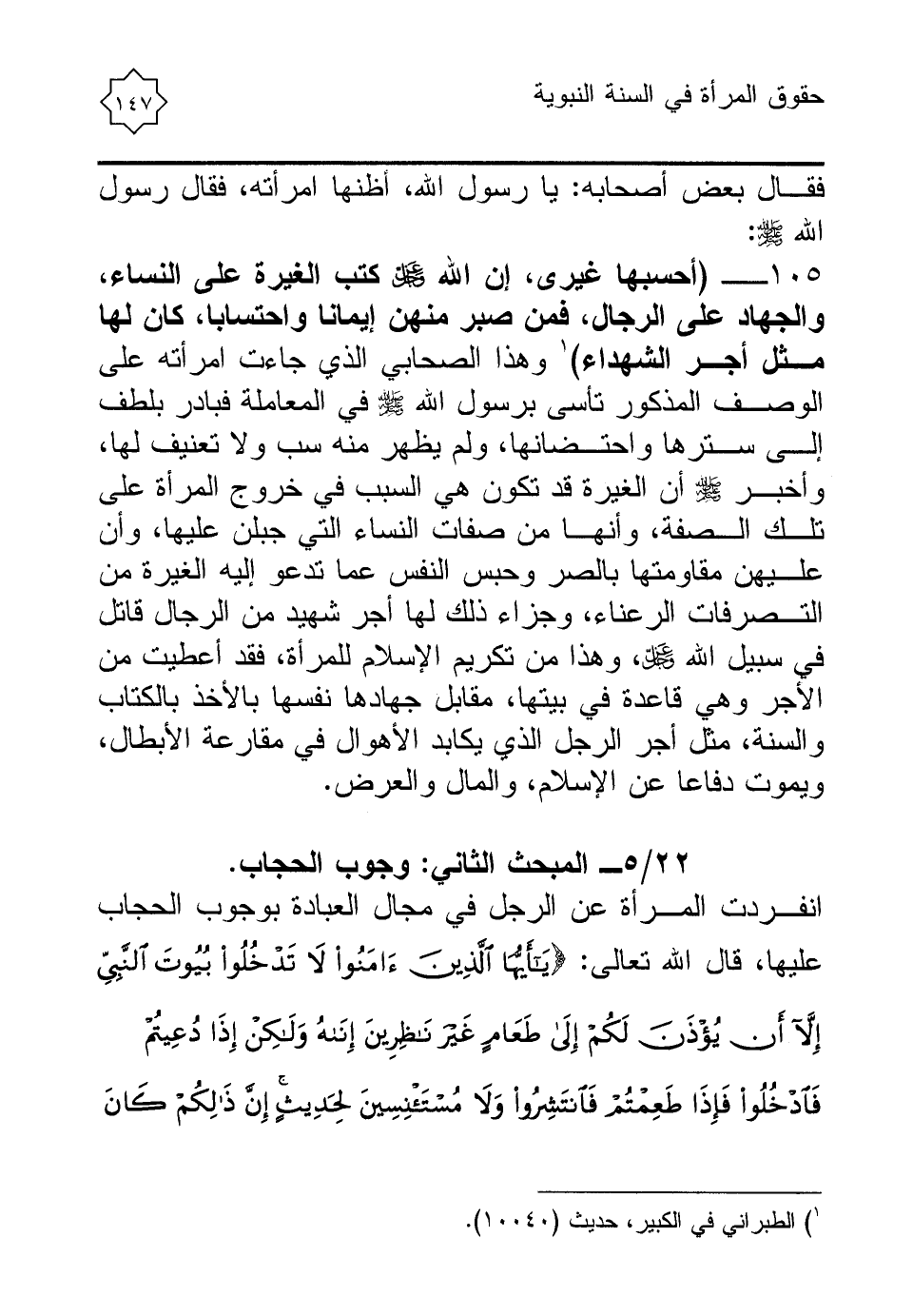 105 - (أحسبها غيرى، إن الله - عز وجل - كتب الغيرة على النساء، والجهاد على الرجال، فمن صبر منهن إيمانا واحتسابا، كان لها مثل أجر الشهداء) (¬1)، وهذا الصحابي الذي جاءت امرأته على الوصف المذكور تأسى برسول الله - صلى الله عليه وسلم - في المعاملة فبادر بلطف إلى سترها واحتضانها، ولم يظهر منه سب ولا تعنيف لها، وأخبر - صلى الله عليه وسلم - أن الغيرة قد تكون هي السبب في خروج المرأة على تلك الصفة، وأنها من صفات النساء التي جبلن عليها، وأن عليهن مقاومتها بالصر وحبس النفس عما تدعو إليه الغيرة من التصرفات الرعناء، وجزاء ذلك لها أجر شهيد من الرجال قاتل في سبيل الله - عز وجل -، وهذا من تكريم الإسلام للمرأة، فقد أعطيت من الأجر وهي قاعدة في بيتها، مقابل جهادها نفسها بالأخذ بالكتاب والسنة، مثل أجر الرجل الذي يكابد الأهوال في مقارعة الأبطال، ويموت دفاعا عن الإسلام، والمال والعرض.
