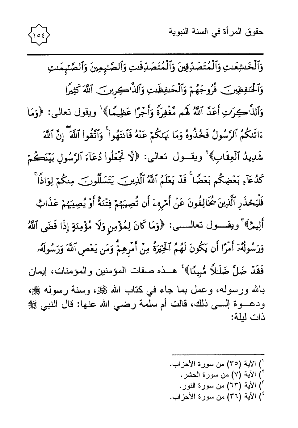 وَالْخَاشِعَاتِ وَالْمُتَصَدِّقِينَ وَالْمُتَصَدِّقَاتِ وَالصَّائِمِينَ وَالصَّائِمَاتِ وَالْحَافِظِينَ فُرُوجَهُمْ وَالْحَافِظَاتِ وَالذَّاكِرِينَ اللَّهَ كَثِيرًا وَالذَّاكِرَاتِ أَعَدَّ اللَّهُ لَهُمْ مَغْفِرَةً وَأَجْرًا عَظِيمًا} (¬1) ويقول تعالى: {وَمَا آتَاكُمُ الرَّسُولُ فَخُذُوهُ وَمَا نَهَاكُمْ عَنْهُ فَانْتَهُوا} (¬2) ويقول تعالى: {لَا تَجْعَلُوا دُعَاءَ الرَّسُولِ بَيْنَكُمْ كَدُعَاءِ بَعْضِكُمْ بَعْضًا قَدْ يَعْلَمُ اللَّهُ الَّذِينَ يَتَسَلَّلُونَ مِنْكُمْ لِوَاذًا فَلْيَحْذَرِ الَّذِينَ يُخَالِفُونَ عَنْ أَمْرِهِ أَنْ تُصِيبَهُمْ فِتْنَةٌ أَوْ يُصِيبَهُمْ عَذَابٌ أَلِيمٌ} (¬3) ويقول تعالى: {وَمَا كَانَ لِمُؤْمِنٍ وَلَا مُؤْمِنَةٍ إِذَا قَضَى اللَّهُ وَرَسُولُهُ أَمْرًا أَنْ يَكُونَ لَهُمُ الْخِيَرَةُ مِنْ أَمْرِهِمْ وَمَنْ يَعْصِ اللَّهَ وَرَسُولَهُ فَقَدْ ضَلَّ ضَلَالًا مُبِينًا} (¬4) هذه صفات المؤمنين والمؤمنات، إيمان بالله ورسوله، وعمل بما جاء في كتاب الله - عز وجل -، وسنة رسوله - صلى الله عليه وسلم -، ودعوة إلى ذلك، قالت أم سلمة رضي الله عنها: قال النبي - صلى الله عليه وسلم - ذات ليلة: