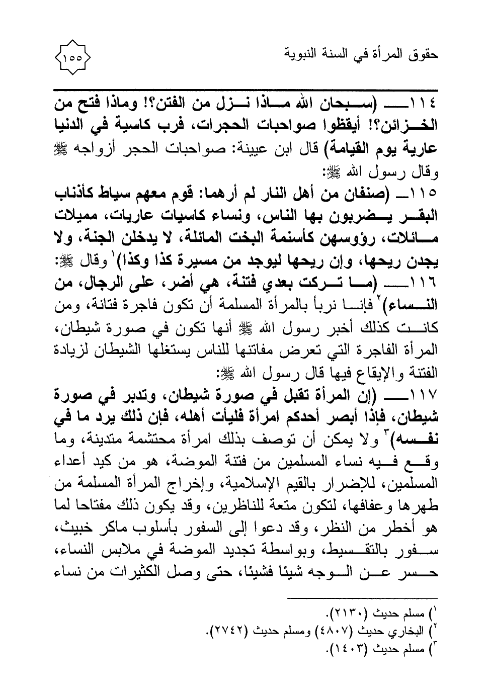 114 - (سبحان الله ماذا نزل من الفتن؟ ! وماذا فتح من الخزائن؟ ! أيقظوا صواحبات الحجرات، فرب كاسية في الدنيا عارية يوم القيامة) قال ابن عيينة: صواحبات الحجر أزواجه - صلى الله عليه وسلم - وقال رسول الله - صلى الله عليه وسلم -: