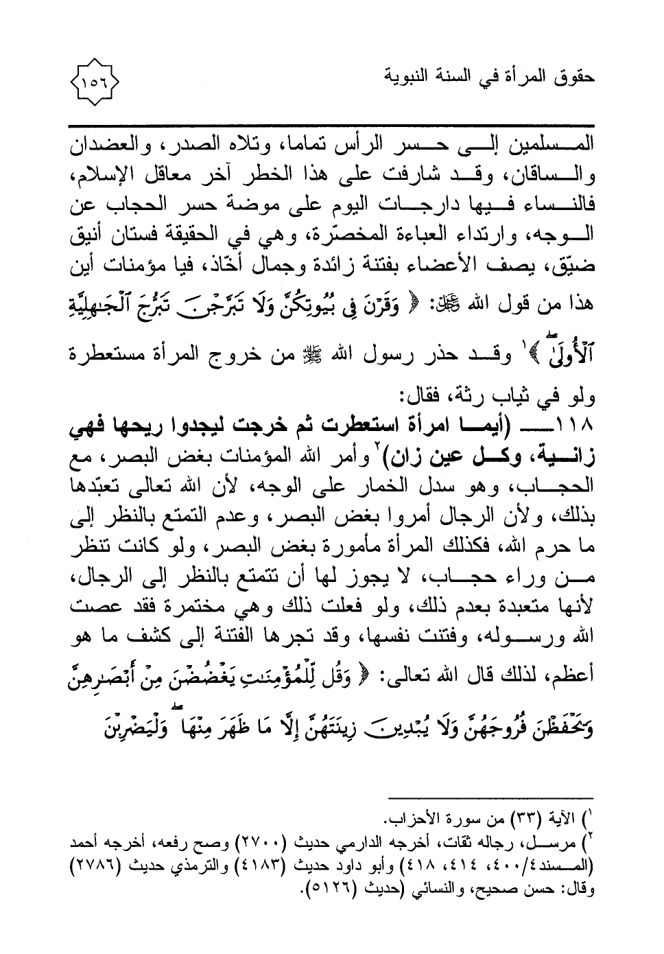 118 - (أيما امرأة استعطرت ثم خرجت ليجدوا ريحها فهي زانية، وكل عين زان) (¬2)، المراد هنا زنى النظر، قال رسول الله - صلى الله عليه وسلم -: (فالعين تزني وزناها النظر) (¬3)، الحديث، وأمر الله المؤمنات بغض البصر، مع الحجاب، وهو سدل الخمار على الوجه، لأن الله تعالى تعبّدها بذلك، ولأن الرجال أمروا بغض البصر، وعدم التمتع بالنظر إلى ما حرم الله، فكذلك المرأة مأمورة بغض البصر، ولو كانت تنظر من وراء حجاب، لا يجوز لها أن تتمتع بالنظر إلى الرجال، لأنها متعبدة بعدم ذلك، ولو فعلت ذلك وهي مختمرة فقد عصت الله ورسوله، وفتنت نفسها، وقد تجرها الفتنة إلى كشف ما هو أعظم، لذلك قال الله تعالى: {وَقُلْ لِلْمُؤْمِنَاتِ يَغْضُضْنَ مِنْ أَبْصَارِهِنَّ وَيَحْفَظْنَ فُرُوجَهُنَّ وَلَا يُبْدِينَ زِينَتَهُنَّ إِلَّا مَا ظَهَرَ مِنْهَا وَلْيَضْرِبْنَ