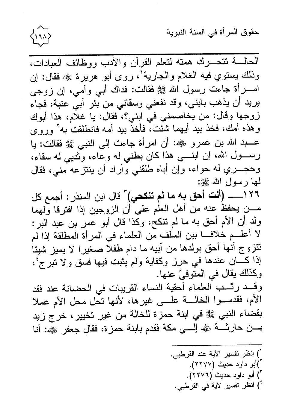 126 - (أنت أحق به ما لم تنكحي) (¬3) قال ابن المنذر: أجمع كل من يحفظ عنه من أهل العلم على أن الزوجين إذا افترقا ولهما ولد أن الأم أحق به ما لم تنكح، وكذا قال أبو عمر بن عبد البر: لا أعلم خلافا بين السلف من العلماء في المرأة المطلقة إذا لم تتزوج أنها أحق بولدها من أبيه ما دام طفلا صغيرا لا يميز شيئا إذا كان عندها في حرز وكفاية ولم يثبت فيها فسق ولا تبرج (¬4)، وكذلك يقال في المتوفىّ عنها.