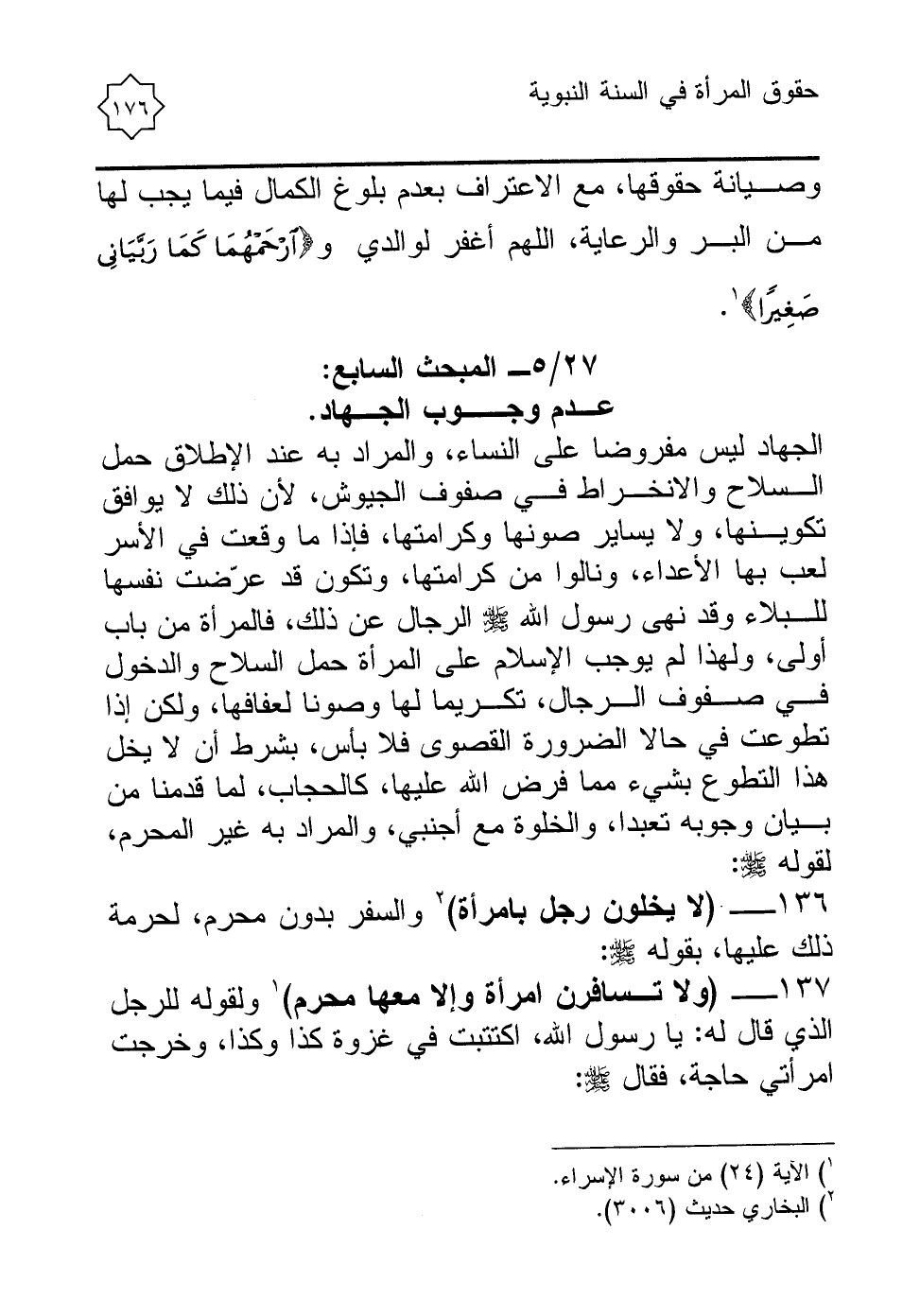 136 - (لا يخلون رجل بامرأة) (¬2) والسفر بدون محرم، لحرمة ذلك عليها، بقوله - صلى الله عليه وسلم -:
