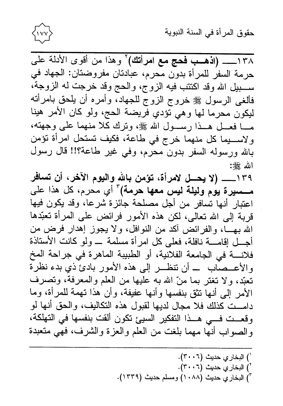 138 - (اذهب فحج مع امرأتك) (¬1) وهذا من أقوى الأدلة على حرمة السفر للمرأة بدون محرم، عبادتان مفروضتان: الجهاد في سبيل الله وقد اكتتب فيه الزوج، والحج وقد خرجت له الزوجة، فألغى الرسول - صلى الله عليه وسلم - خروج الزوج للجهاد، وأمره أن يلحق بامرأته ليكون محرما لها وهي تؤدي فريضة الحج، ولو كان الأمر هينا ما فعل هذا رسول الله - صلى الله عليه وسلم -، وترك كلا منهما على وجهته، ولاسيما كل منهما خرج في طاعة، فكيف تستحل امرأة تؤمن بالله ورسوله السفر بدون محرم، وفي غير طاعة؟ ! ! قال رسول الله - صلى الله عليه وسلم -: