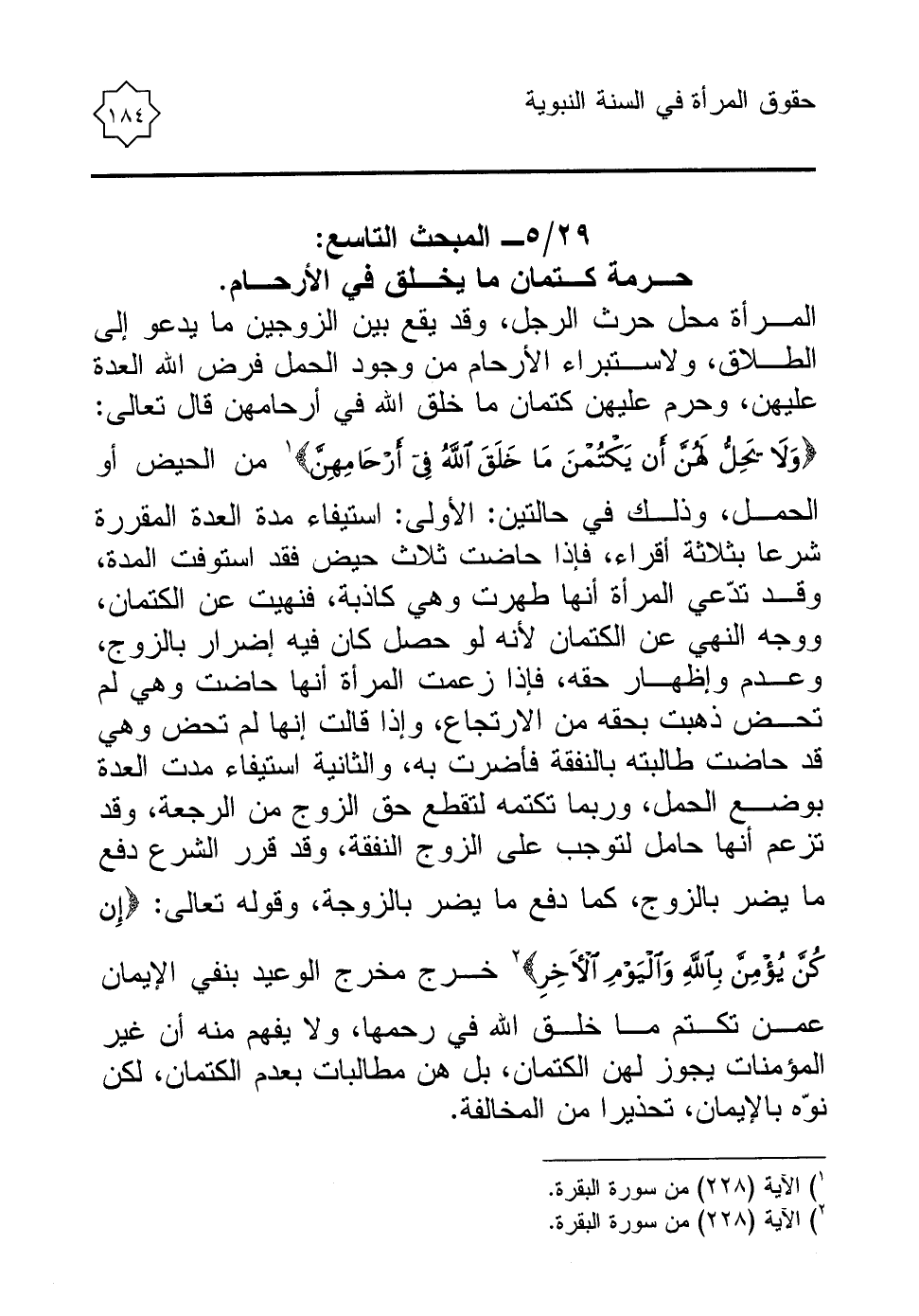 المرأة محل حرث الرجل، وقد يقع بين الزوجين ما يدعو إلى الطلاق، ولاستبراء الأرحام من وجود الحمل فرض الله العدة عليهن، وحرم عليهن كتمان ما خلق الله في أرحامهن قال تعالى: {وَلَا يَحِلُّ لَهُنَّ أَنْ يَكْتُمْنَ مَا خَلَقَ اللَّهُ فِي أَرْحَامِهِنَّ} (¬1) من الحيض أو الحمل، وذلك في حالتين: الأولى: استيفاء مدة العدة المقررة شرعا بثلاثة أقراء، فإذا حاضت ثلاث حيض فقد استوفت المدة، وقد تدّعي المرأة أنها طهرت وهي كاذبة، فنهيت عن الكتمان، ووجه النهي عن الكتمان لأنه لو حصل كان فيه إضرار بالزوج، وعدم وإظهار حقه، فإذا زعمت المرأة أنها حاضت وهي لم تحض ذهبت بحقه من الارتجاع، وإذا قالت إنها لم تحض وهي قد حاضت طالبته بالنفقة فأضرت به، والثانية استيفاء مدت العدة بوضع الحمل، وربما تكتمه لتقطع حق الزوج من الرجعة، وقد تزعم أنها حامل لتوجب على الزوج النفقة، وقد قرر الشرع دفع ما يضر بالزوج، كما دفع ما يضر بالزوجة، وقوله تعالى: {إِنْ كُنَّ يُؤْمِنَّ بِاللَّهِ وَالْيَوْمِ الْآخِرِ} (¬2) خرج مخرج الوعيد بنفي الإيمان عمن تكتم ما خلق الله في رحمها، ولا يفهم منه أن غير المؤمنات يجوز لهن الكتمان، بل هن مطالبات بعدم الكتمان، لكن نوّه بالإيمان، تحذيرا من المخالفة.
