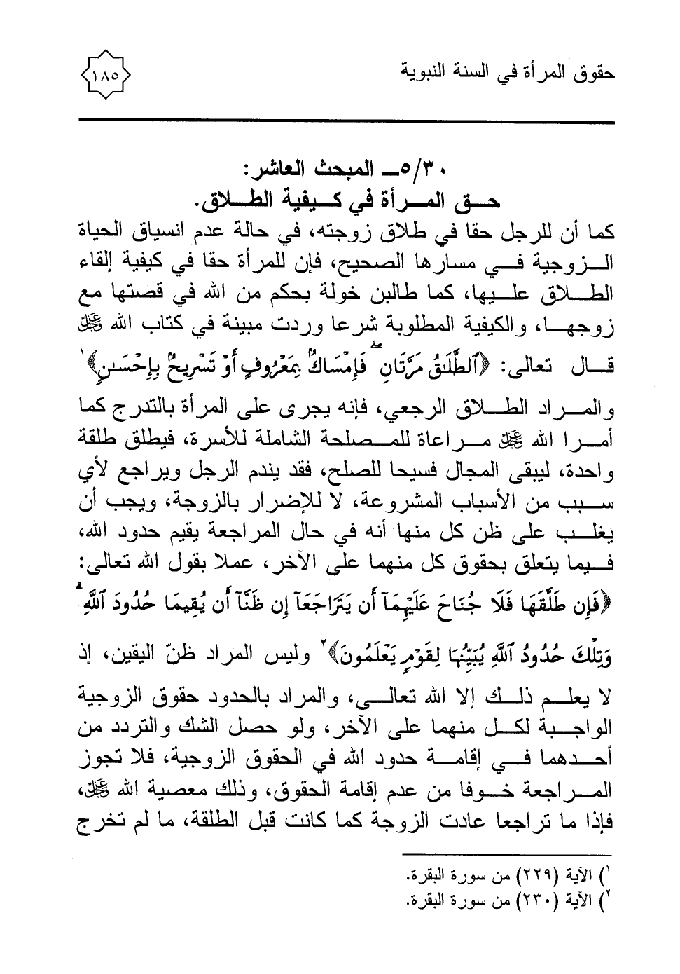 كما أن للرجل حقا في طلاق زوجته، في حالة عدم انسياق الحياة الزوجية في مسارها الصحيح، فإن للمرأة حقا في كيفية إلقاء الطلاق عليها، كما طالبن خولة بحكم من الله في قصتها مع زوجها، والكيفية المطلوبة شرعا وردت مبينة في كتاب الله - عز وجل - قال تعالى: {الطَّلَاقُ مَرَّتَانِ فَإِمْسَاكٌ بِمَعْرُوفٍ أَوْ تَسْرِيحٌ بِإِحْسَانٍ} (¬1) والمراد الطلاق الرجعي، فإنه يجرى على المرأة بالتدرج كما أمرا الله - عز وجل - مراعاة للمصلحة الشاملة للأسرة، فيطلق طلقة واحدة، ليبقى المجال فسيحا للصلح، فقد يندم الرجل ويراجع لأي سبب من الأسباب المشروعة، لا للإضرار بالزوجة، ويجب أن يغلب على ظن كل منها أنه في حال المراجعة يقيم حدود الله، فيما يتعلق بحقوق كل منهما على الآخر، عملا بقول الله تعالى: {فَإِنْ طَلَّقَهَا فَلَا جُنَاحَ عَلَيْهِمَا أَنْ يَتَرَاجَعَا إِنْ ظَنَّا أَنْ يُقِيمَا حُدُودَ اللَّهِ وَتِلْكَ حُدُودُ اللَّهِ يُبَيِّنُهَا لِقَوْمٍ يَعْلَمُونَ} (¬2) وليس المراد ظنّ اليقين، إذ لا يعلم ذلك إلا الله تعالى، والمراد بالحدود حقوق الزوجية الواجبة لكل منهما على الآخر، ولو حصل الشك والتردد من أحدهما في إقامة حدود الله في الحقوق الزوجية، فلا تجوز المراجعة خوفا من عدم إقامة الحقوق، وذلك معصية الله - عز وجل -، فإذا ما تراجعا عادت الزوجة كما كانت قبل الطلقة، ما لم تخرج