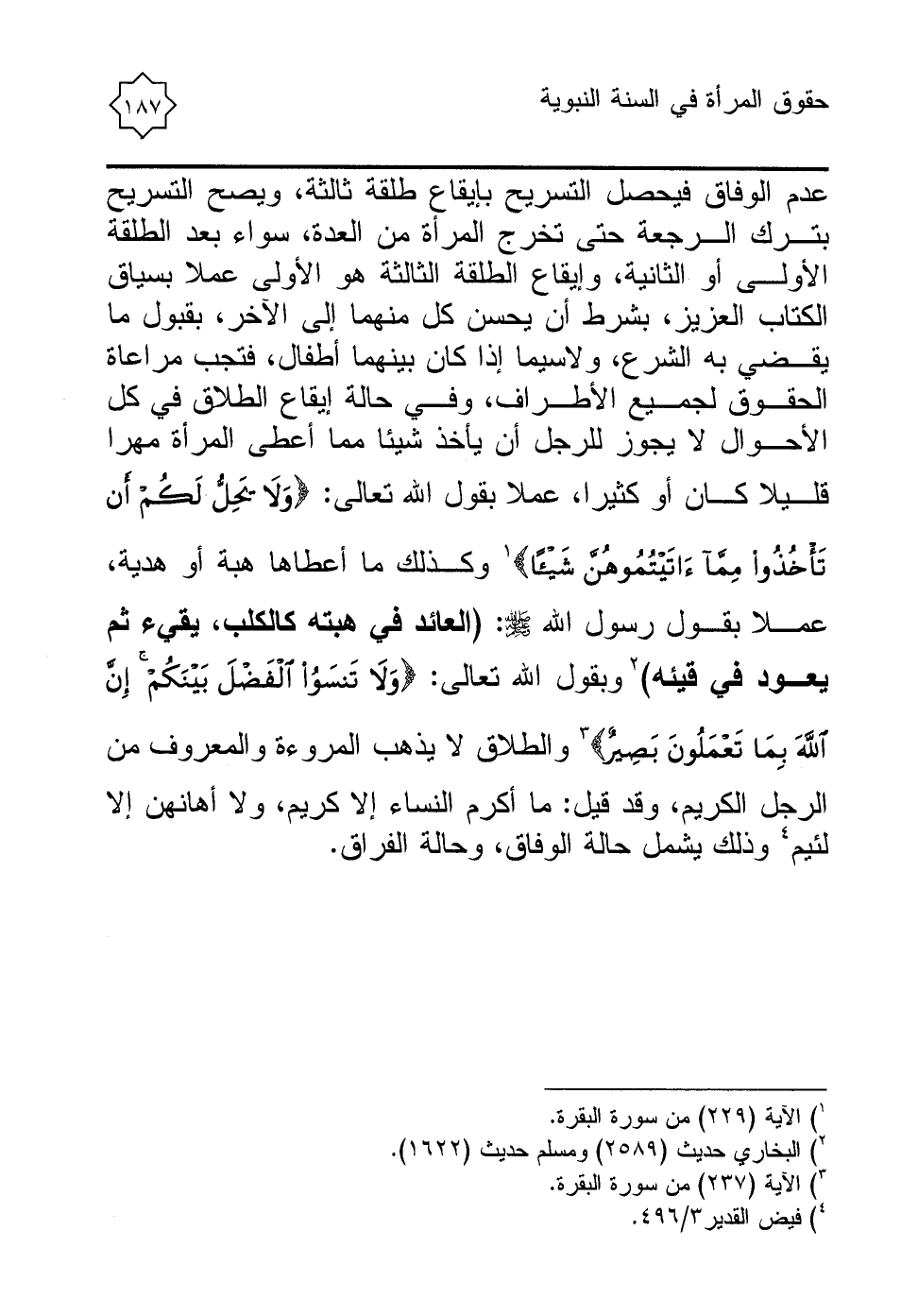 عدم الوفاق فيحصل التسريح بإيقاع طلقة ثالثة، ويصح التسريح بترك الرجعة حتى تخرج المرأة من العدة، سواء بعد الطلقة الأولى أو الثانية، وإيقاع الطلقة الثالثة هو الأولى عملا بسياق الكتاب العزيز، بشرط أن يحسن كل منهما إلى الآخر، بقبول ما يقضي به الشرع، ولاسيما إذا كان بينهما أطفال، فتجب مراعاة الحقوق لجميع الأطراف، وفي حالة إيقاع الطلاق في كل الأحوال لا يجوز للرجل أن يأخذ شيئا مما أعطى المرأة مهرا قليلا كان أو كثيرا، عملا بقول الله تعالى: {وَلَا يَحِلُّ لَهُنَّ أَنْ يَكْتُمْنَ مَا خَلَقَ اللَّهُ فِي أَرْحَامِهِنَّ} (¬1) وكذلك ما أعطاها هبة أو هدية، عملا بقول رسول الله - صلى الله عليه وسلم -: (العائد في هبته كالكلب، يقيء ثم يعود في قيئه) (¬2) وبقول الله تعالى: {وَلَا تَنْسَوُا الْفَضْلَ بَيْنَكُمْ إِنَّ اللَّهَ بِمَا تَعْمَلُونَ بَصِيرٌ} (¬3) والطلاق لا يذهب المروءة والمعروف من الرجل الكريم، وقد قيل: ما أكرم النساء إلا كريم، ولا أهانهن إلا لئيم (¬4) وذلك يشمل حالة الوفاق، وحالة الفراق.
