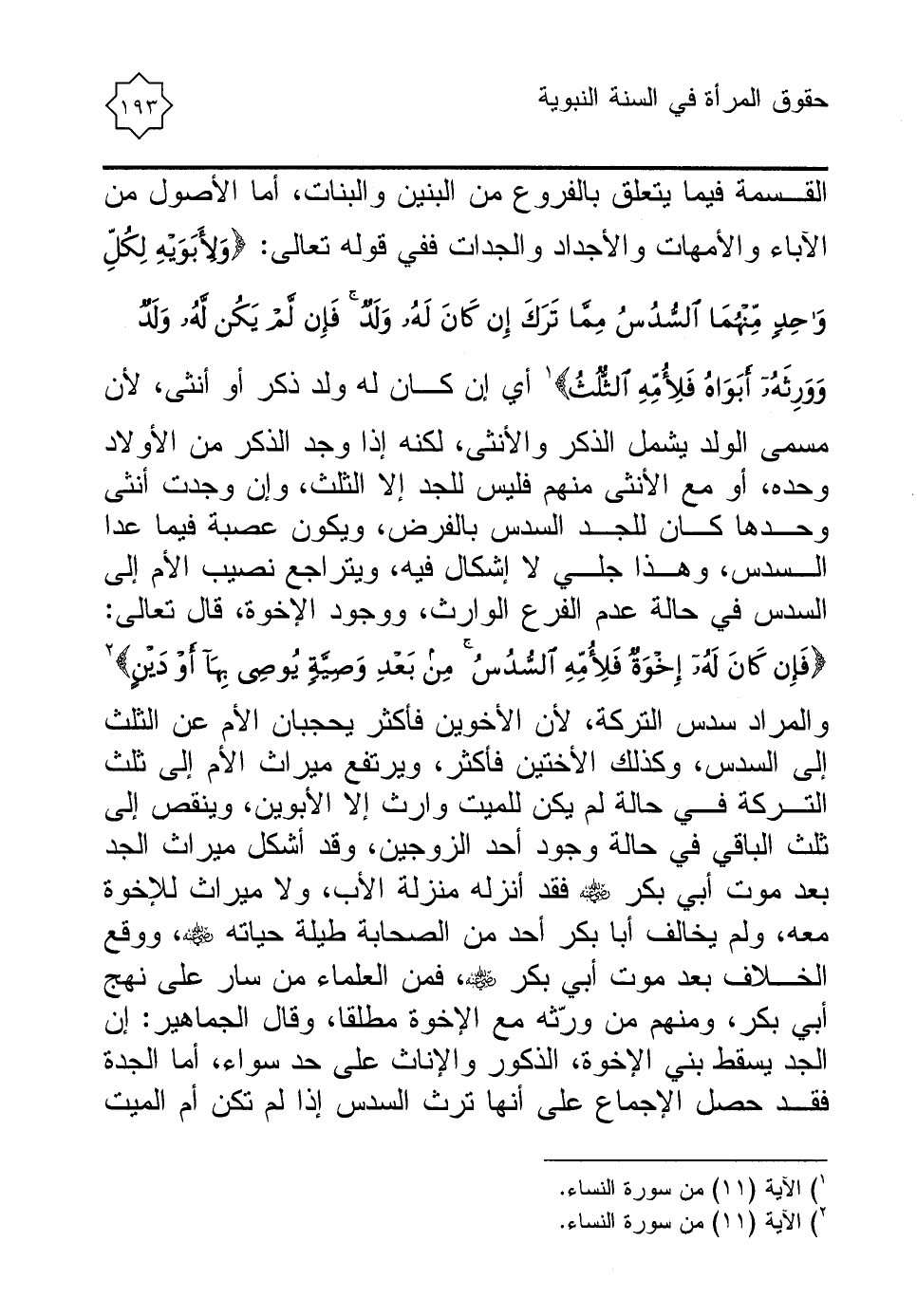القسمة فيما يتعلق بالفروع من البنين والبنات، أما الأصول من الآباء والأمهات والأجداد والجدات ففي قوله تعالى: {وَلِأَبَوَيْهِ لِكُلِّ وَاحِدٍ مِنْهُمَا السُّدُسُ مِمَّا تَرَكَ إِنْ كَانَ لَهُ وَلَدٌ فَإِنْ لَمْ يَكُنْ لَهُ وَلَدٌ وَوَرِثَهُ أَبَوَاهُ فَلِأُمِّهِ الثُّلُثُ} (¬1) أي إن كان له ولد ذكر أو أنثى، لأن مسمى الولد يشمل الذكر والأنثى، لكنه إذا وجد الذكر من الأولاد وحده، أو مع الأنثى منهم فليس للجد إلا الثلث، وإن وجدت أنثى وحدها كان للجد السدس بالفرض، ويكون عصبة فيما عدا السدس، وهذا جلي لا إشكال فيه، ويتراجع نصيب الأم إلى السدس في حالة عدم الفرع الوارث، ووجود الإخوة، قال تعالى: {فَإِنْ كَانَ لَهُ إِخْوَةٌ فَلِأُمِّهِ السُّدُسُ مِنْ بَعْدِ وَصِيَّةٍ يُوصِي بِهَا أَوْ دَيْنٍ} (¬2) والمراد سدس التركة، لأن الأخوين فأكثر يحجبان الأم عن الثلث إلى السدس، وكذلك الأختين فأكثر، ويرتفع ميراث الأم إلى ثلث التركة في حالة لم يكن للميت وارث إلا الأبوين، وينقص إلى ثلث الباقي في حالة وجود أحد الزوجين، وقد أشكل ميراث الجد بعد موت أبي بكر - رضي الله عنه - فقد أنزله منزلة الأب، ولا ميراث للإخوة معه، ولم يخالف أبا بكر أحد من الصحابة طيلة حياته - رضي الله عنه -، ووقع الخلاف بعد موت أبي بكر - رضي الله عنه -، فمن العلماء من سار على نهج أبي بكر، ومنهم من ورّثه مع الإخوة مطلقا، وقال الجماهير: إن الجد يسقط بني الإخوة، الذكور والإناث على حد سواء، أما الجدة فقد حصل الإجماع على أنها ترث السدس إذا لم تكن أم الميت