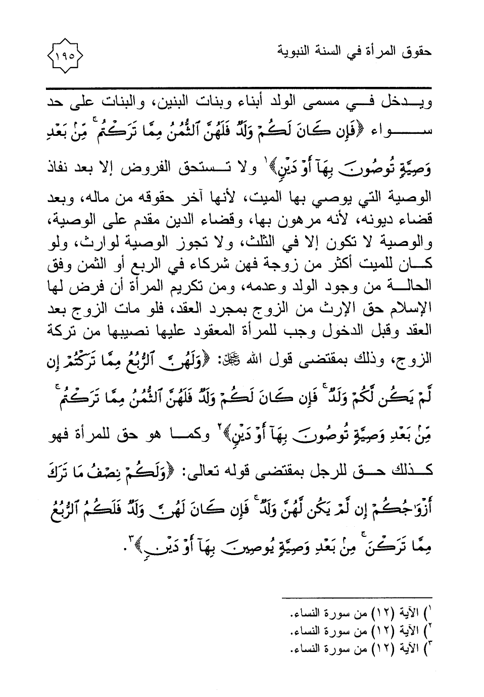 ويدخل في مسمى الولد أبناء وبنات البنين، والبنات على حد سواء {فَإِنْ كَانَ لَكُمْ وَلَدٌ فَلَهُنَّ الثُّمُنُ مِمَّا تَرَكْتُمْ مِنْ بَعْدِ وَصِيَّةٍ تُوصُونَ بِهَا أَوْ دَيْنٍ} (¬1) ولا تستحق الفروض إلا بعد نفاذ الوصية التي يوصي بها الميت، لأنها آخر حقوقه من ماله، وبعد قضاء ديونه، لأنه مرهون بها، وقضاء الدين مقدم على الوصية، والوصية لا تكون إلا في الثلث، ولا تجوز الوصية لوارث، ولو كان للميت أكثر من زوجة فهن شركاء في الربع أو الثمن وفق الحالة من وجود الولد وعدمه، ومن تكريم المرأة أن فرض لها الإسلام حق الإرث من الزوج بمجرد العقد، فلو مات الزوج بعد العقد وقبل الدخول وجب للمرأة المعقود عليها نصيبها من تركة الزوج، وذلك بمقتضى قول الله - عز وجل -: {وَلَهُنَّ الرُّبُعُ مِمَّا تَرَكْتُمْ إِنْ لَمْ يَكُنْ لَكُمْ وَلَدٌ فَإِنْ كَانَ لَكُمْ وَلَدٌ فَلَهُنَّ الثُّمُنُ مِمَّا تَرَكْتُمْ مِنْ بَعْدِ وَصِيَّةٍ تُوصُونَ بِهَا أَوْ دَيْنٍ} (¬2) وكما هو حق للمرأة فهو كذلك حق للرجل بمقتضى قوله تعالى: {وَلَكُمْ نِصْفُ مَا تَرَكَ أَزْوَاجُكُمْ إِنْ لَمْ يَكُنْ لَهُنَّ وَلَدٌ فَإِنْ كَانَ لَهُنَّ وَلَدٌ فَلَكُمُ الرُّبُعُ مِمَّا تَرَكْنَ مِنْ بَعْدِ وَصِيَّةٍ يُوصِينَ بِهَا أَوْ دَيْنٍ} (¬3).