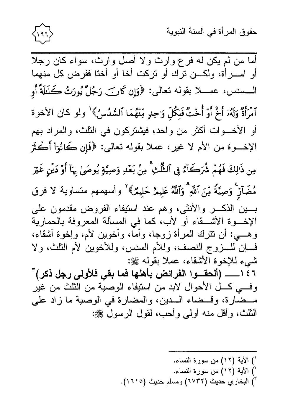 146 - (ألحقوا الفرائض بأهلها فما بقي فلأولى رجل ذكر) (¬3) وفي كل الأحوال لابد من استيفاء الوصية من الثلث من غير مضارة، وقضاء الدين، والمضارة في الوصية ما زاد على الثلث، وأقل منه أولى وأحب، لقول الرسول - صلى الله عليه وسلم -: