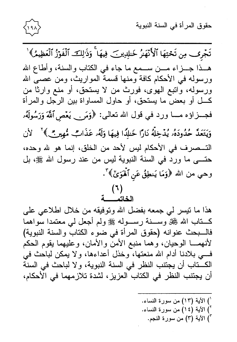 هذا ما تيسر لي جمعه بفضل الله وتوفيقه من خلال اطلاعي على كتاب الله - عز وجل - وسنة رسوله - صلى الله عليه وسلم - ولم أجعل لي معتمدا سواهما فالبحث عنوانه (حقوق المرأة في ضوء الكتاب والسنة النبوية) لأنهما الوحيان، وهما منبع الأمن والأمان، وعليهما يقوم الحكم في بلادنا أدام الله منعتها، وخذل أعداءها، ولا يمكن لباحث في الكتاب أن يجتنب النظر في السنة النبوية، ولا لباحث في السنة أن يجتنب النظر في الكتاب العزيز، لشدة تلازمهما في الأحكام،
