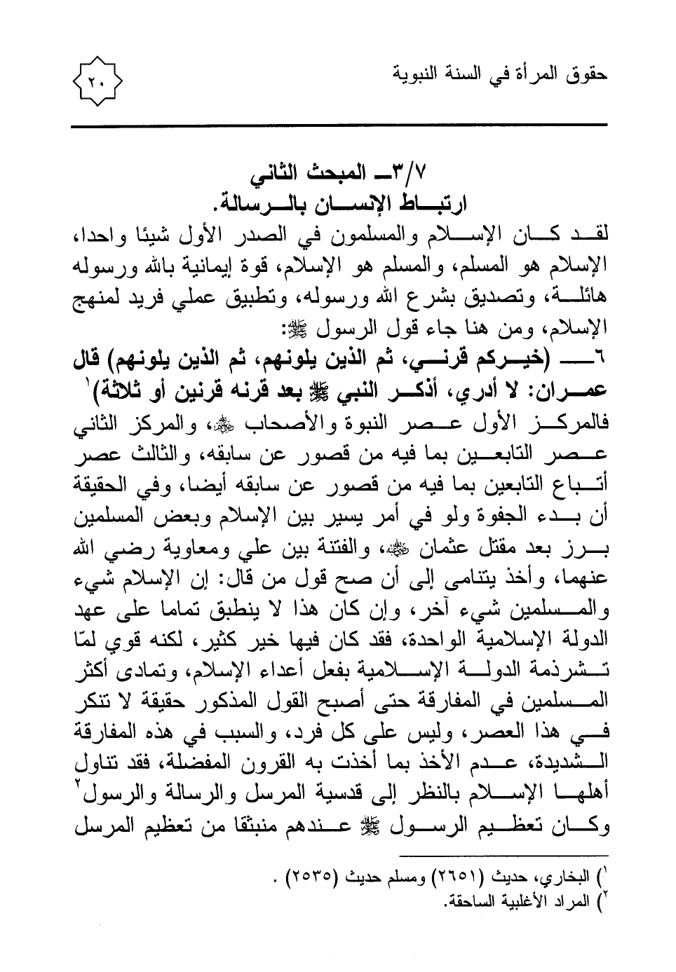 6 - (خيركم قرني، ثم الذين يلونهم، ثم الذين يلونهم) قال عمران: لا أدري، أذكر النبي - صلى الله عليه وسلم - بعد قرنه قرنين أو ثلاثة) (¬1) فالمركز الأول عصر النبوة والأصحاب - رضي الله عنهم -، والمركز الثاني عصر التابعين بما فيه من قصور عن سابقه، والثالث عصر أتباع التابعين بما فيه من قصور عن سابقه أيضا، وفي الحقيقة أن بدء الجفوة ولو في أمر يسير بين الإسلام وبعض المسلمين برز بعد مقتل عثمان - رضي الله عنه -، والفتنة بين علي ومعاوية رضي الله عنهما، وأخذ يتنامى إلى أن صح قول من قال: إن الإسلام شيء والمسلمين شيء آخر، وإن كان هذا لا ينطبق تماما على عهد الدولة الإسلامية الواحدة، فقد كان فيها خير كثير، لكنه قوي لمّا تشرذمة الدولة الإسلامية بفعل أعداء الإسلام، وتمادى أكثر المسلمين في المفارقة حتى أصبح القول المذكور حقيقة لا تنكر في هذا العصر، وليس على كل فرد، والسبب في هذه المفارقة الشديدة، عدم الأخذ بما أخذت به القرون المفضلة، فقد تناول أهلها الإسلام بالنظر إلى قدسية المرسل والرسالة والرسول (¬2) وكان تعظيم الرسول - صلى الله عليه وسلم - عندهم منبثقا من تعظيم المرسل